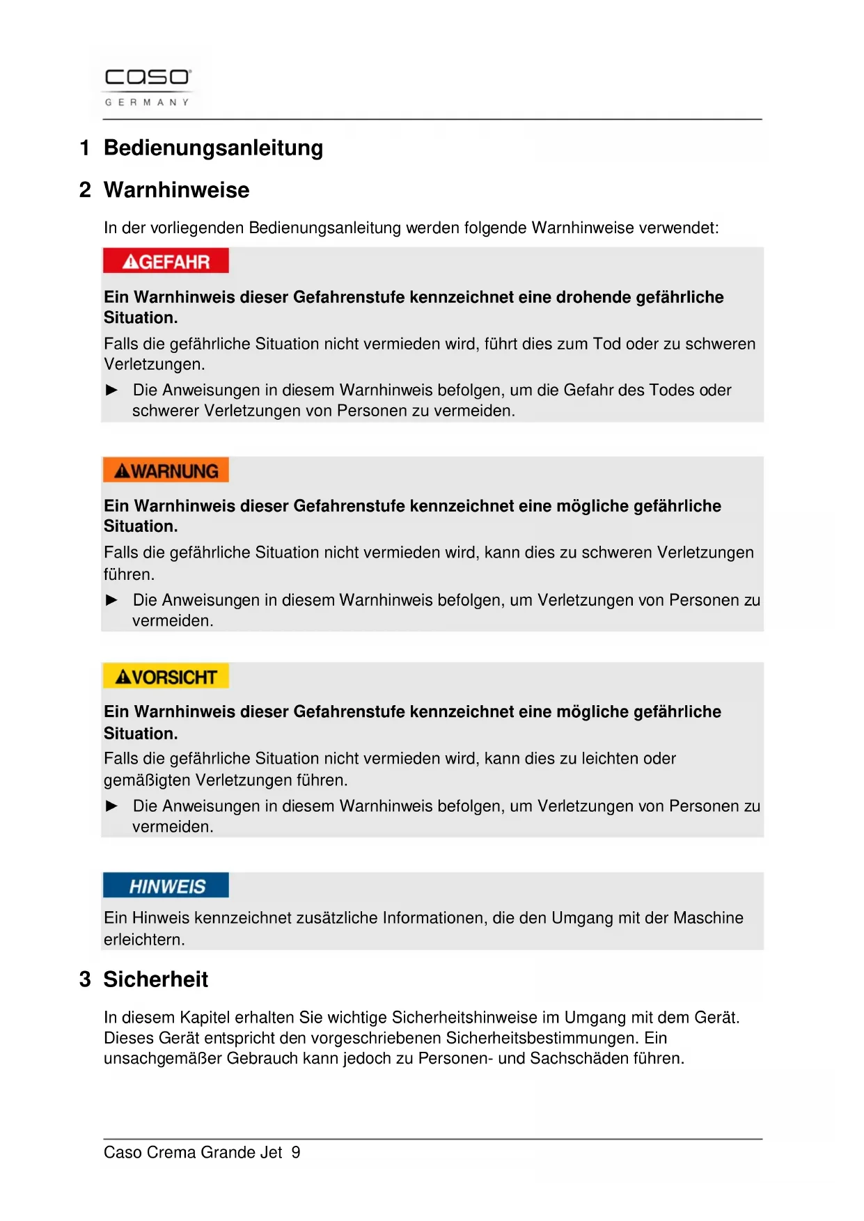 77 Garantie ............................................................................ 82 78 Technische gegevens ...................................................... 82Caso Crema Grande Jet 9 1 Bedienungsanleitung 2 Warnhinweise In der vorliegenden Bedienungsanleitung werden folgende Warnhinweise verwendet: Ein Warnhinweis dieser Gefahrenstufe kennzeichnet eine drohende gefährliche Situation. Falls die gefährliche Situation nicht vermieden wird, führt dies zum Tod oder zu schweren Verletzungen. ► Die Anweisungen in diesem Warnhinweis befolgen, um die Gefahr des Todes oder schwerer Verletzungen von Personen zu vermeiden.