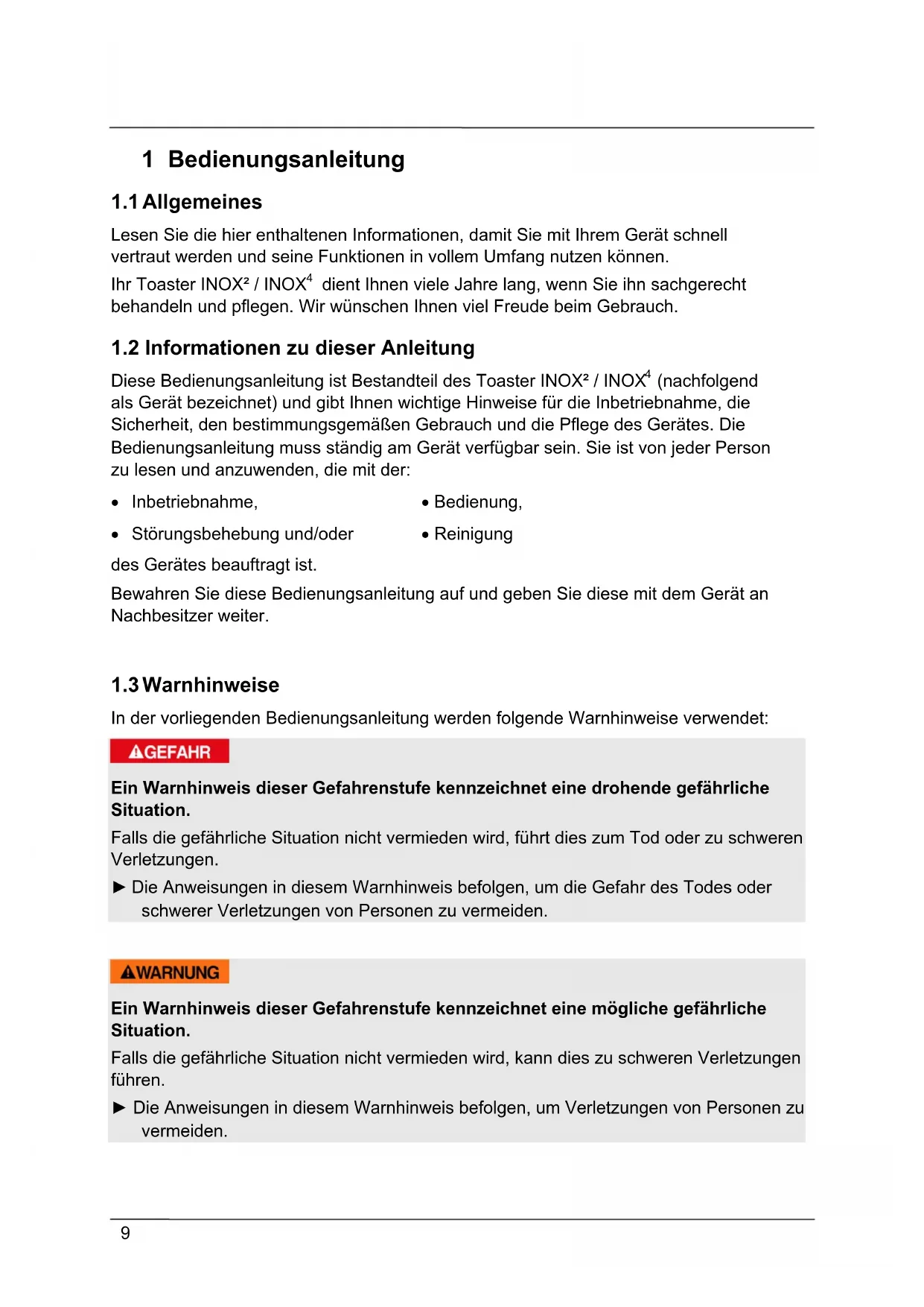 These Bedienungsanleitung ist Bestandteil des Toaster INOX² / INOX⁴ (nachfolgend als Gerät bezeichnet) und gibt Ihnen wichtige Hinweise für die Inbetriebnahme, die Sicherheit, den bestimmungsgemäßen Gebrauch und die Pflege des Gerätes. Die Bedienungsanleitung muss ständig am Gerät verfügbar sein. Sie ist von jeder Person zulesen und anzuwenden, die mit der: