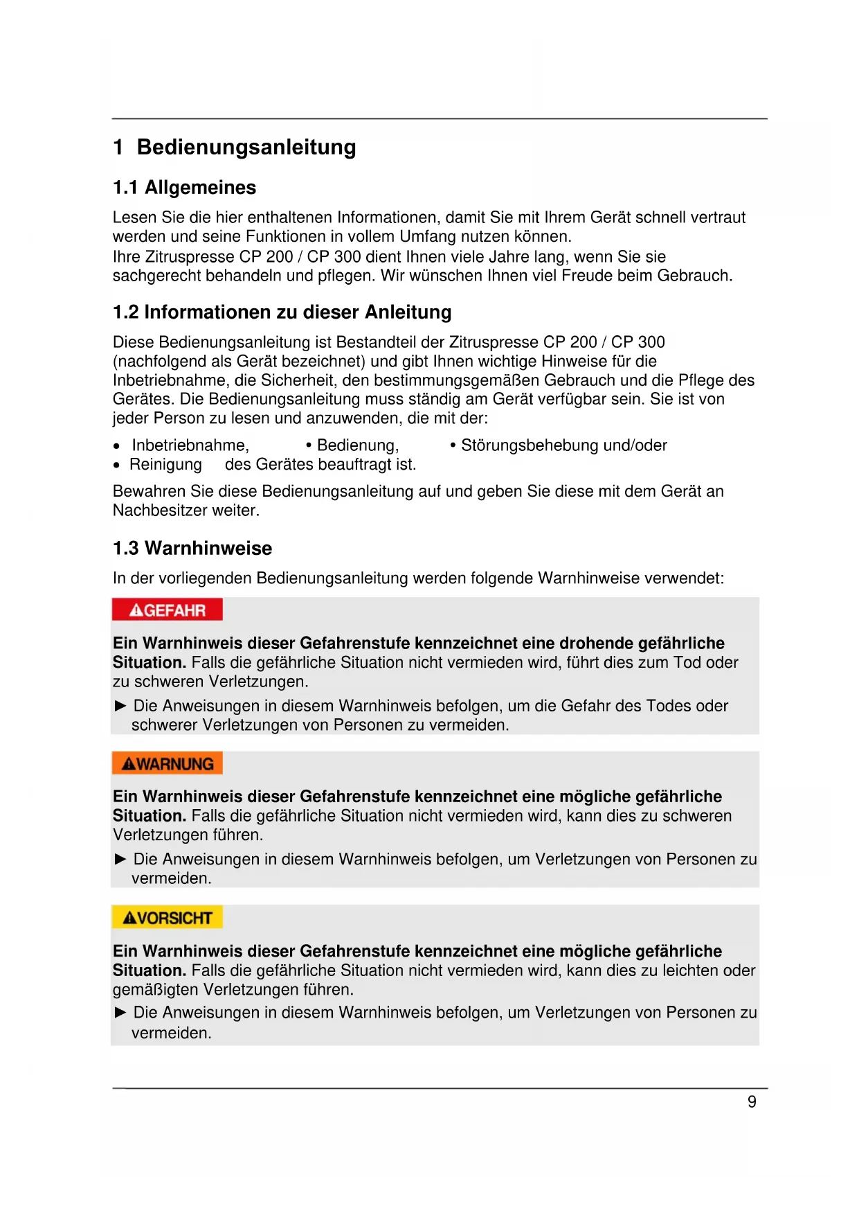 Diese Bedienungsanleitung ist Bestandteil der Zitruspresse CP 200 / CP 300 (nachfolgend als Gerät bezeichnet) und gibt Ihnen wichtige Hinweise für die Inbetriebnahme, die Sicherheit, den bestimmungsgemäßen Gebrauch und die Pflege des Gerätes. Die Bedienungsanleitung muss ständig am Gerät verfügbar sein. Sie ist von jeder Person zu lesen und anzuwenden, die mit der: