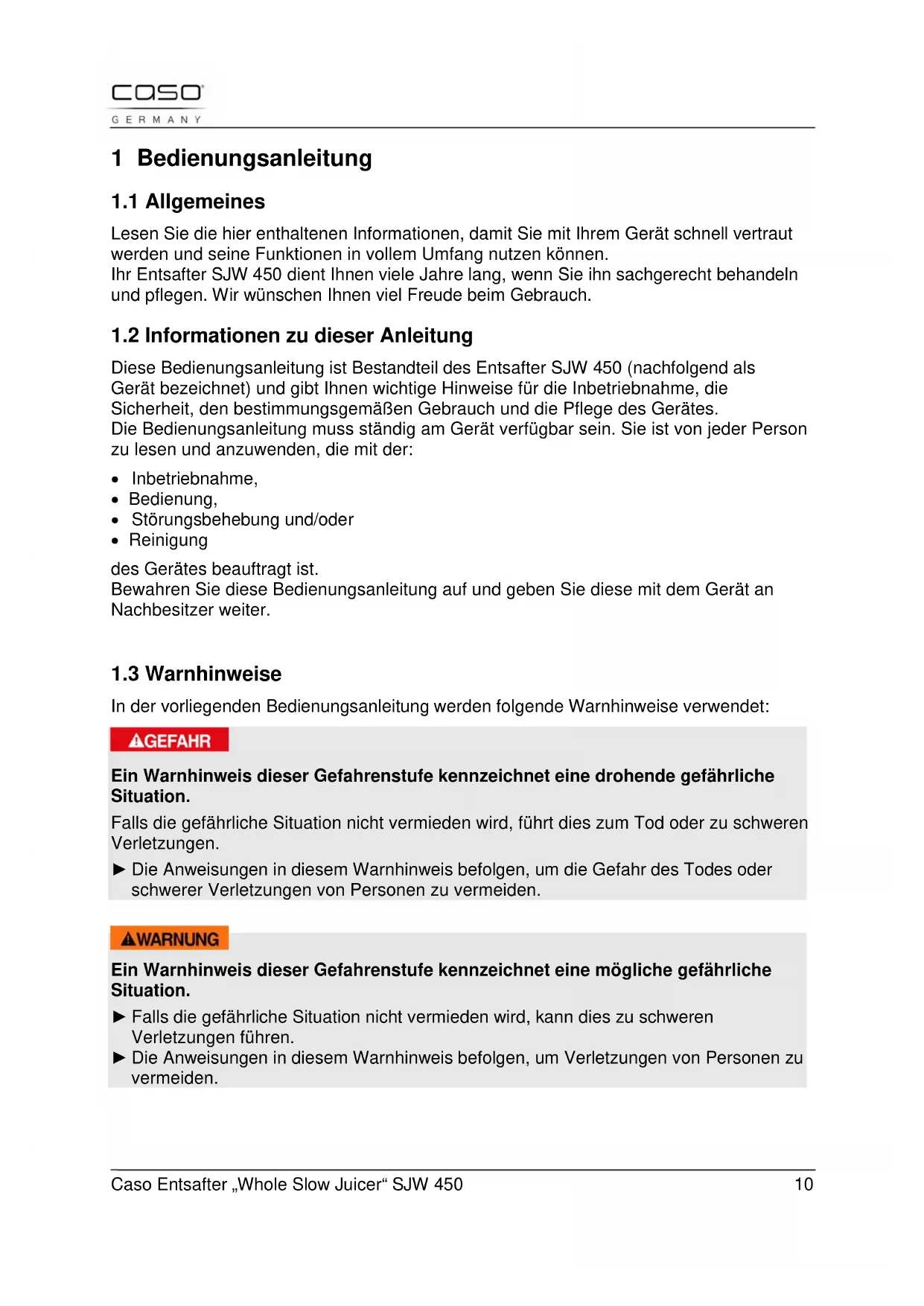 Ein Warnhinweis dieser Gefahrenstufe kennzeichnet eine mögliche gefährliche Situation. ► Falls die gefährliche Situation nicht vermieden wird, kann dies zu schweren Verletzungen führen. ► Die Anweisungen in diesem Warnhinweis befolgen, um Verletzungen von Personen zu vermeiden.Caso Entsafter „Whole Slow Juicer“ SJW 450 11