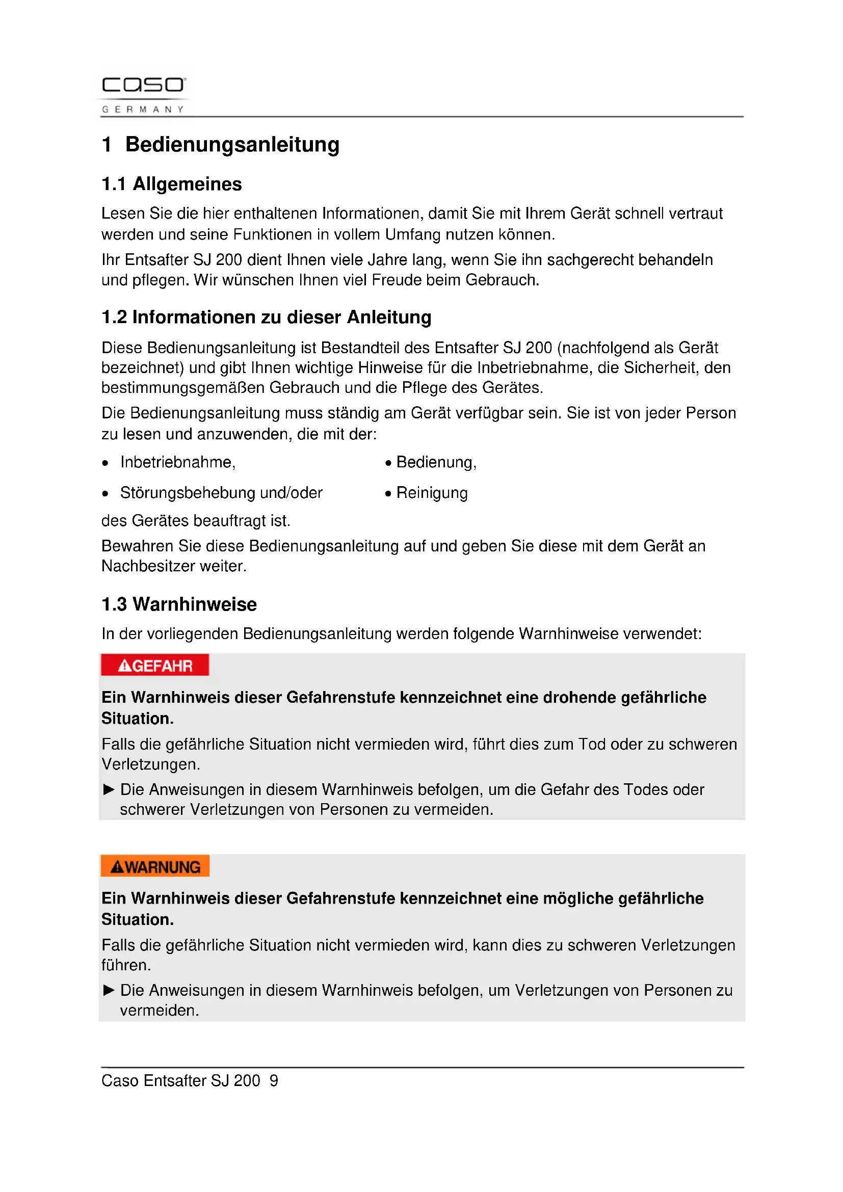Ein Warnhinweis dieser Gefahrenstufe kennzeichnet eine mögliche gefährliche Situation. Falls die gefährliche Situation nicht vermieden wird, kann dies zu schweren Verletzungen führen. ► Die Anweisungen in diesem Warnhinweis befolgen, um Verletzungen von Personen zu vermeiden.Caso Entsafter SJ 200 10