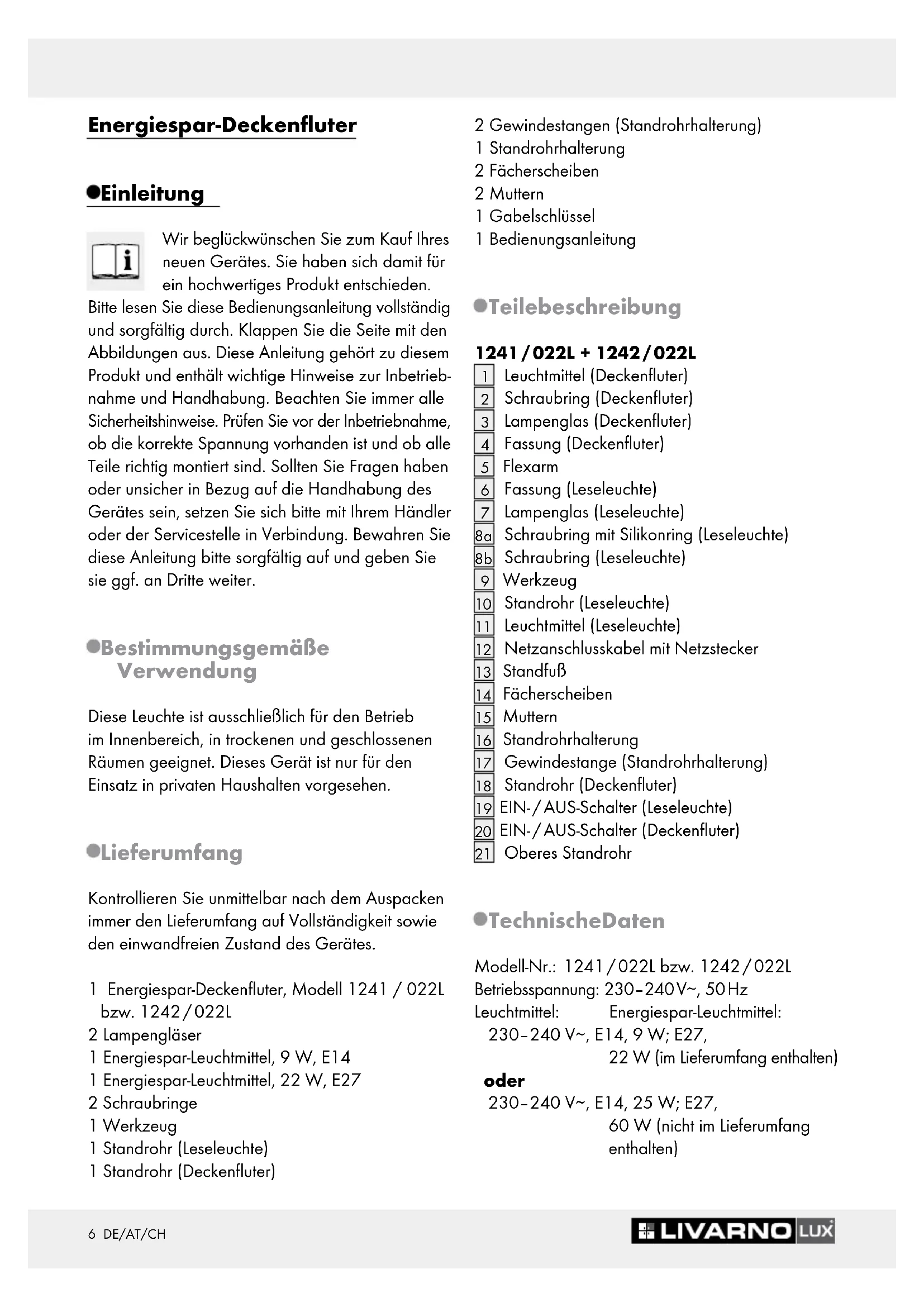 8a5 DE/AT/CH Inhaltsverzeichnis Einleitung Bestimmungsgemäße Verwendung ....................................................................................................Seite 6 Lieferumfang ........................................................................................................................................ Seite 6 Teilebeschreibung ...............................................................................................................................Seite 6 Technische Daten ................................................................................................................................Seite 6 Sicherheit Sicherheitshinweise .............................................................................................................................Seite 7 Inbetriebnahme Leuchte montieren ...............................................................................................................................Seite 8 Leuchte ein- / ausschalten ...................................................................................................................Seite 8 Leuchte ausrichten ............................................................................................................................... Seite 8 Leuchtmittel wechseln ..........................................................................................................................Seite 9 Wartung und Reinigung .....................................................................................................Seite 9 Entsorgung .....................................................................................................................................Seite 9 Garantie und Service Garantieerklärung ...............................................................................................................................Seite 9 Serviceadresse ....................................................................................................................................Seite 9 Konformitätserklärung .........................................................................................................................Seite 10 Hersteller ..............................................................................................................................................Seite 106 DE/AT/CH Einleitung / SicherheitEinleitung Energiespar-Deckenfluter Einleitung Wir beglückwünschen Sie zum Kauf Ihres neuen Gerätes. Sie haben sich damit für ein hochwertiges Produkt entschieden. Bitte lesen Sie diese Bedienungsanleitung vollständig und sorgfältig durch. Klappen Sie die Seite mit den Abbildungen aus. Diese Anleitung gehört zu diesem Produkt und enthält wichtige Hinweise zur Inbetrieb- nahme und Handhabung. Beachten Sie immer alle Sicherheitshinweise. Prüfen Sie vor der Inbetriebnahme, ob die korrekte Spannung vorhanden ist und ob alle Teile richtig montiert sind. Sollten Sie Fragen haben oder unsicher in Bezug auf die Handhabung des Gerätes sein, setzen Sie sich bitte mit Ihrem Händler oder der Servicestelle in Verbindung. Bewahren Sie diese Anleitung bitte sorgfältig auf und geben Sie sie ggf. an Dritte weiter. Bestimmungsgemäße Verwendung Diese Leuchte ist ausschließlich für den Betrieb im Innenbereich, in trockenen und geschlossenen Räumen geeignet. Dieses Gerät ist nur für den Einsatz in privaten Haushalten vorgesehen. Lieferumfang Kontrollieren Sie unmittelbar nach dem Auspacken immer den Lieferumfang auf Vollständigkeit sowie den einwandfreien Zustand des Gerätes. 1 Energiespar-Deckenfluter, Modell 1241 / 022L bzw. 1242 / 022L 2 Lampengläser 1 Energiespar-Leuchtmittel, 9 W, E14 1 Energiespar-Leuchtmittel, 22 W, E27 2 Schraubringe 1 Werkzeug 1 Standrohr (Leseleuchte) 1 Standrohr (Deckenfluter) 2 Gewindestangen (Standrohrhalterung) 1 Standrohrhalterung 2 Fächerscheiben 2 Muttern 1 Gabelschlüssel 1 Bedienungsanleitung Teilebeschreibung 1241 / 022L + 1242 / 022L