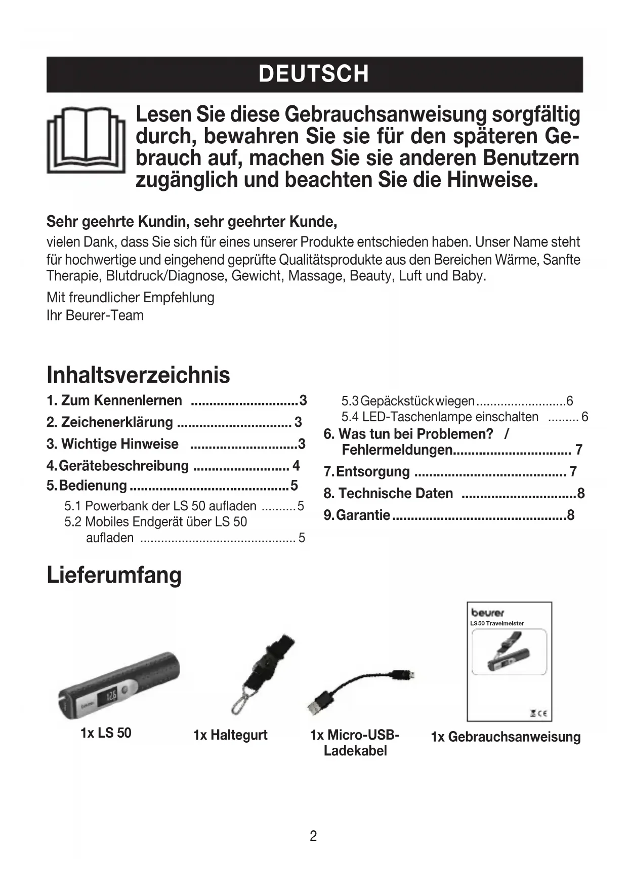 Lieferumfang LS 50 Travelmeister 1x Haltegurt 1x LS 50 1x Micro-USB- Ladekabel 1x Gebrauchsanweisung3