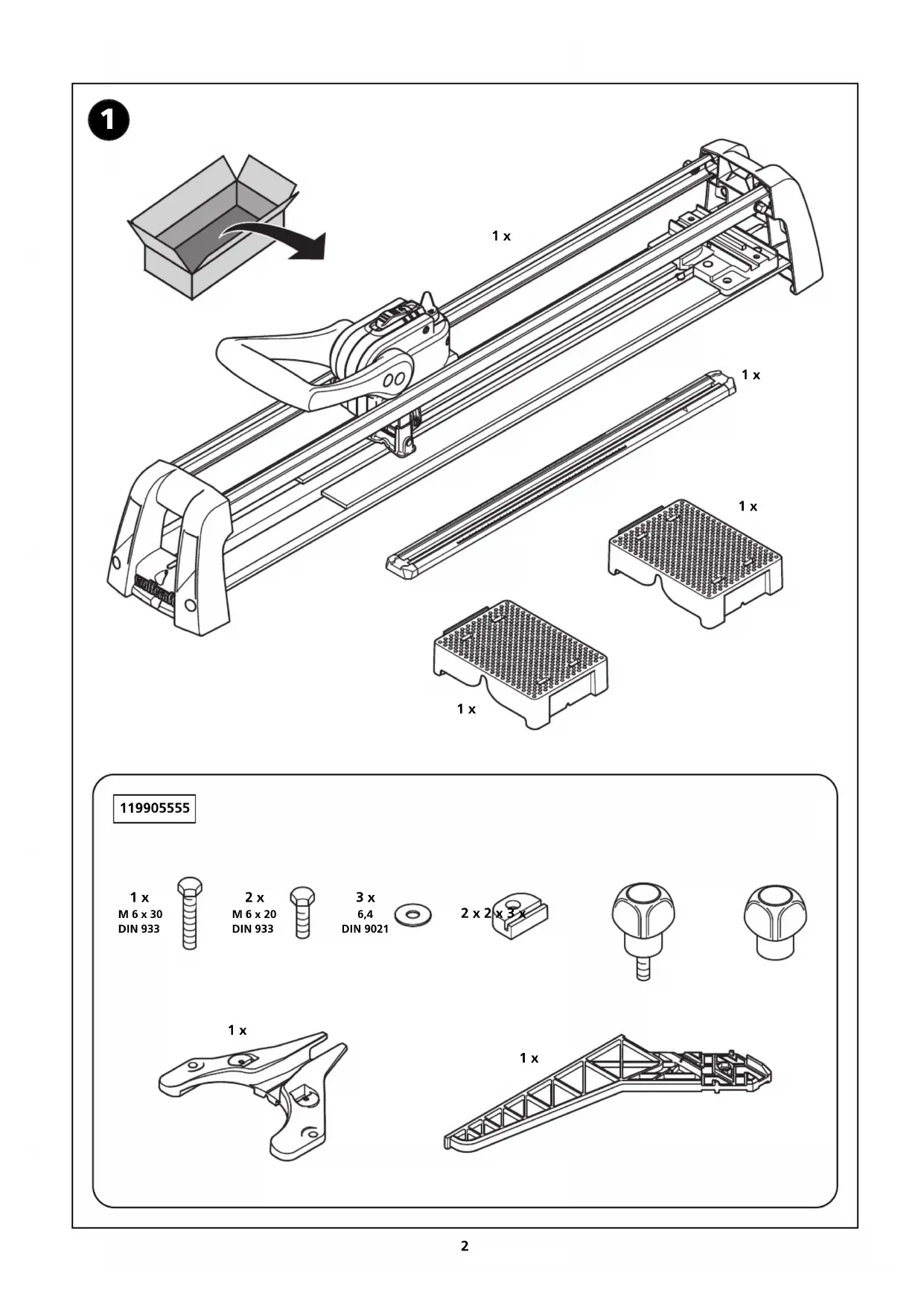 - Verlängern Sie den Brechbügel nicht mit einem Hebel. BDAL 5555.000_116305555 26.09.2012 12:10 Uhr Seite 1011 LIEFERUMFANG Packen Sie den Fliesenschneider TC 670 Expert aus dem Karton aus und überprüfen Sie den Inhalt auf Vollständigkeit aller abgebildeten Teile (Bild 1). MONTAGE Bringen Sie zuerst zum Feststellen die Schneideinheit in die abgebildete Position und schwenken den Bügel in Pfeilrichtung. Anschließend entnehmen Sie die beiden Materialauflagen vom Fliesenschneider (Bild 2). Montieren Sie nun den Serien- bzw Winkelanschlag (Bild 3). Anschließend den Diagonalanschlag lose montieren, auf die Führung stecken und die beiden Drehgriffe festziehen (Bild 4). Die beiden Materialauflagen können je nach Anwendung eingehangen werden (Bild 5). ARBEITSHINWEISE Parallelschnitte (90°) Zum Lösen der Schneideinheit den Bügel in Pfeilrichtung schwenken, und die Schneideinheit bis an das Gehäuse schieben (Bild 6). Anschließend die Materialauflagen einhängen. Eintellen der Materialstärke und der Schnittbreite: Messen Sie zuerst die Fliesenstärke. Stellen Sie nun den Verstellhebel (Stufen 4 - 12 mm) wie in der Tabelle abgebildet an der Schneideinheit ein. Legen Sie anschließend die Fliese bis zum Anschlag in das Gerät. Sie haben die Möglichkeit direkt über den Winkalanschlag Schnittbreiten von 50 - 300 mm einzustellen (im Detail: Beispiel = 160 mm) oder die Schnittbreite mit einem geeigneten Stift auf die Fliese zu übertragen (Bild 7). Überprüfen Sie das alle drei Griffschrauben am Lineal fest angezogen sind. Anritzen der Fliesenoberfläche: Stellen Sie den Hebel auf Position “min”. Setzen Sie nun das Schneidrad an der Fliese an und schieben Sie die Schneideinheit am Bügel bis zur Endposition / Anschlag durch. ACHTUNG: Sollte beim Anritzen der Fliese zu wenig Druck mit dem Schneidrad ausgeübt werden, muss der Hebel auf Position “max.” verstellt werden. Bei Bedarf kann auch der Verstellhebel auf die nächst kleinere Stufe “4 - 12 mm” gestellt werden. Führen Sie immer einen Probeschnitt durch (Bild 8). Brechen der Fliese: Legen Sie den Hebel gleichmäßig in Pfeilrichtung nach hinten um und drücken ihn hinunter. Der Brechstempel muss nahe an der Vorderkante der Fliese positioniert sein, hier befindet sich zur Unterstützung eines leichten Trennvorgangs ein Brechkeil in der Grundplatte. Die Fliese bricht entlang der angeritzten Linie (Bild 9). Diagonalschnitte (45°), quadratische Fliesen Montieren Sie den Winkelanschlag wie abgebildet. Richten Sie die Fliese mit einer Ecke in der V-Nut am Anschlagblock im Gerät aus. Schieben Sie den Diagonalanschlag an die Fliese soweite heran, bis in die V-Nut an die Ecke der Fliese stößt. Anschließend beide Griffschrauben festdrehen. Schieben Sie den Winkelanschlag an bis die Fliese heran und drehen Sie die Griffschraube fest (Bild 10). Stellen Sie jetzt die Material- und die Anritzstärke ein (Bilder 7 und 8). Ritzen Sie zuerst die Fliese an, beim nachfolgenden Brechen der Fliese muss die Schneideineit zuerst ein wenig zurückgeschoben werden, damit der Brechstempel komplett auf der Fliese aufsitzt. Die Fliese bricht entlang der angeritzten Linie (Bild 11). Transport Zum Transport schieben Sie die Schneideinheit in die Mitte des Gerätes und legen zur Arretierung den Hebel in Pfeilrichtung um. Anschließend beide Matreialauflagen festklemmen. Diagonal- und Winkelanschlag wie abgebildet montieren und den Fliesenschneider mit beiden Händen waagerecht tragen (Bild 12).