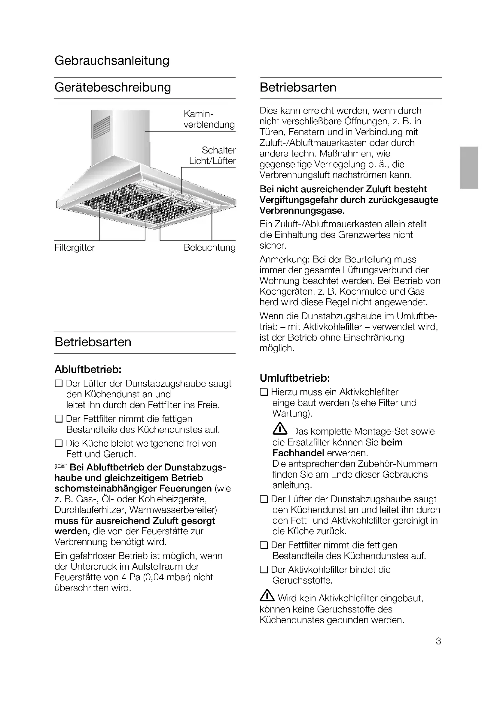 Bei Abluftbetrieb der Dunstabzugs- haube und gleichzeitigem Betrieb schornsteinabhängiger Feuerungen (wie z. B. Gas-, Öl- oder Kohleheizgeräte, Durchlauferhitzer, Warmwasserbereiter) muss für ausreichend Zuluft gesorgt werden, die von der Feuerstätte zur Ver- brennung benötigt wird. Ein gefahrloser Betrieb ist möglich, wenn der Unterdruck im Aufstellraum der Feuerstätte von 4 Pa (0,04 mbar) nicht überschritten wird. Dies kann erreicht werden, wenn durch nicht verschließbare Öffnungen, z. B. in Türen, Fenstern und in Verbindung mit Zuluft-/Abluftmauerkasten oder durch andere techn. Maßnahmen, wie gegenseiti- ge Verriegelung o. ä., die Verbrennungsluft nachströmen kann. Bei nicht ausreichender Zuluft besteht Vergiftungsgefahr durch zurückgesaugte Verbrennungsgase. Ein Zuluft-/Abluftmauerkasten allein stellt die Einhaltung des Grenzwertes nicht sicher. Anmerkung: Bei der Beurteilung muss immer der gesamte Lüftungsverbund der Wohnung beachtet werden. Bei Betrieb von Kochgeräten, z. B. Kochmulde und Gasherd wird diese Regel nicht angewendet. Wenn die Dunstabzugshaube im Umluftbe- trieb – mit Aktivkohlefilter – verwendet wird, ist der Betrieb ohne Einschränkung möglich. Wird die Abluft durch die Außenwand geleitet, sollte ein Teleskop-Mauerkasten verwendet werden.