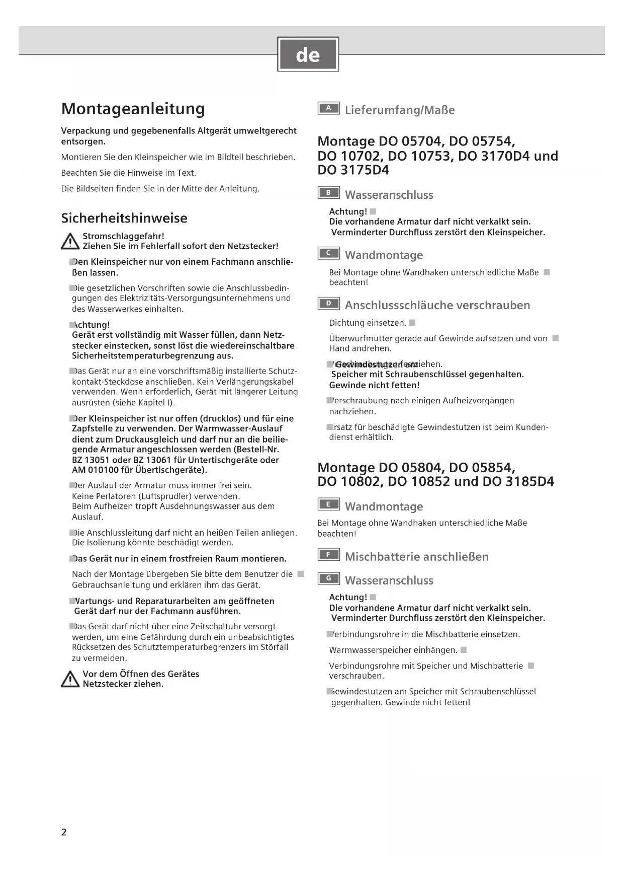 Montageanleitung Verpackung und gegebenenfalls Altgerät umweltgerecht entsorgen.Montieren Sie den Kleinspeicher wie im Bildteil beschrieben.Beachten Sie die Hinweise im Text.Die Bildseiten finden Sie in der Mitte der Anleitung. Sicherheitshinweise Stromschlaggefahr!Ziehen Sie im Fehlerfall sofort den Netzstecker!Den Kleinspeicher nur von einem Fachmann anschlie- ■ßen lassen.Die gesetzlichen Vorschriften sowie die Anschlussbedin- ■gungen des Elektrizitäts-Versorgungsunternehmens und des Wasserwerkes einhalten.Achtung! ■Gerät erst vollständig mit Wasser füllen, dann Netz-stecker einstecken, sonst löst die wiedereinschaltbare Sicherheitstemperaturbegrenzung aus.Das Gerät nur an eine vorschriftsmäßig installierte Schutz- ■kontakt-Steckdose anschließen. Kein Verlängerungskabel verwenden. Wenn erforderlich, Gerät mit längerer Leitung ausrüsten (siehe Kapitel I).Der Kleinspeicher ist nur offen (drucklos) und für eine ■Zapfstelle zu verwenden. Der Warmwasser-Auslauf dient zum Druckausgleich und darf nur an die beilie-gende Armatur angeschlossen werden (Bestell-Nr. BZ 13051 oder BZ 13061 für Untertischgeräte oder AM 010100 für Übertischgeräte).Der Auslauf der Armatur muss immer frei sein. ■Keine Perlatoren (Luftsprudler) verwenden.Beim Aufheizen tropft Ausdehnungswasser aus dem Auslauf.Die Anschlussleitung darf nicht an heißen Teilen anliegen. ■Die Isolierung könnte beschädigt werden.Das Gerät nur in einem frostfreien Raum montieren. ■Nach der Montage übergeben Sie bitte dem Benutzer die ■Gebrauchsanleitung und erklären ihm das Gerät.Wartungs- und Reparaturarbeiten am geöffneten ■ Gerät darf nur der Fachmann ausführen.Das Gerät darf nicht über eine Zeitschaltuhr versorgt ■werden, um eine Gefährdung durch ein unbeabsichtigtes Rücksetzen des Schutztemperaturbegrenzers im Störfall zu vermeiden.Vor dem Öffnen des Gerätes Netzstecker ziehen.