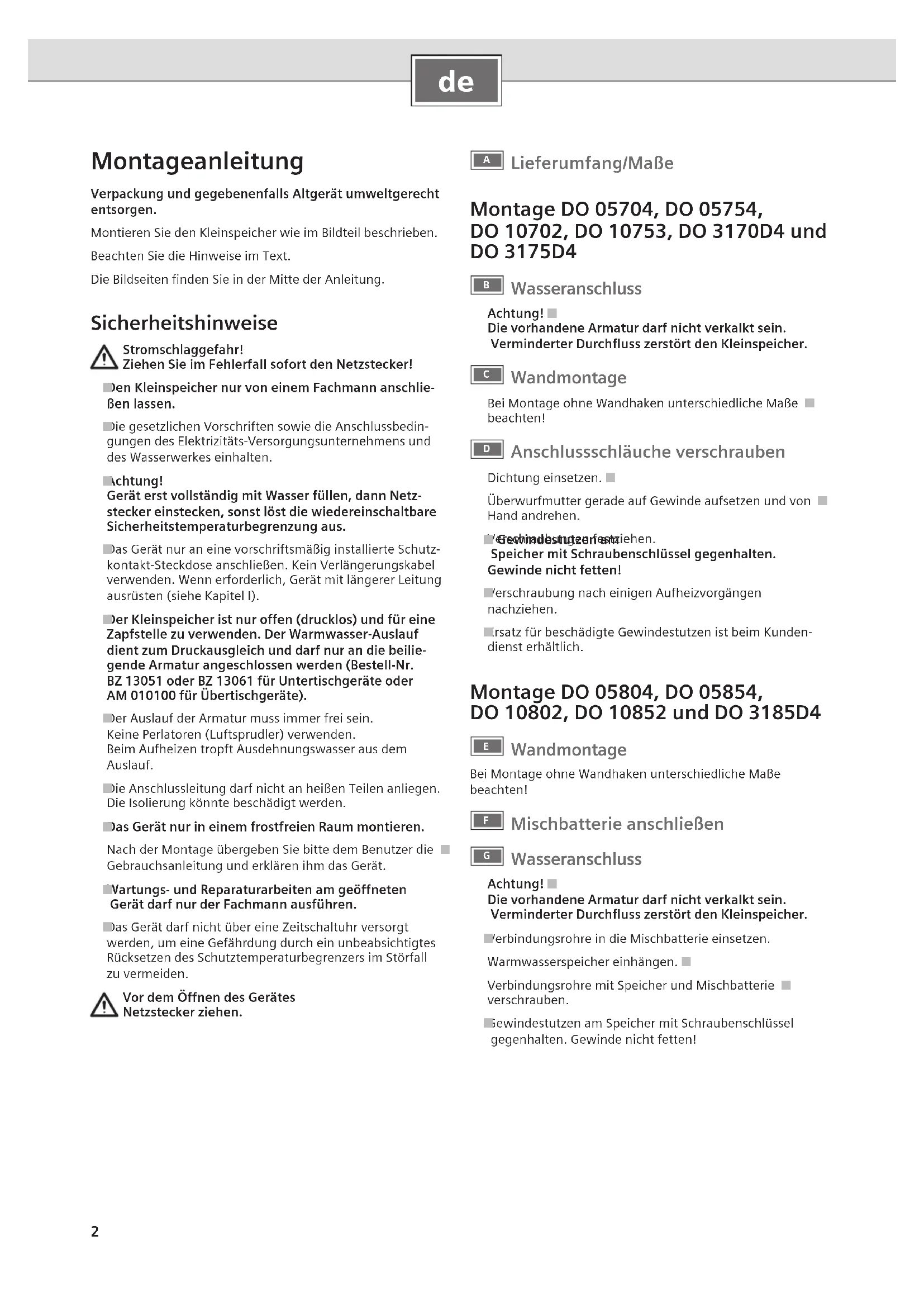 Montageanleitung Verpackung und gegebenenfalls Altgerät umweltgerecht entsorgen.Montieren Sie den Kleinspeicher wie im Bildteil beschrieben.Beachten Sie die Hinweise im Text.Die Bildseiten finden Sie in der Mitte der Anleitung. Sicherheitshinweise Stromschlaggefahr!Ziehen Sie im Fehlerfall sofort den Netzstecker!Den Kleinspeicher nur von einem Fachmann anschlie- ■ßen lassen.Die gesetzlichen Vorschriften sowie die Anschlussbedin- ■gungen des Elektrizitäts-Versorgungsunternehmens und des Wasserwerkes einhalten.Achtung! ■Gerät erst vollständig mit Wasser füllen, dann Netz-stecker einstecken, sonst löst die wiedereinschaltbare Sicherheitstemperaturbegrenzung aus.Das Gerät nur an eine vorschriftsmäßig installierte Schutz- ■kontakt-Steckdose anschließen. Kein Verlängerungskabel verwenden. Wenn erforderlich, Gerät mit längerer Leitung ausrüsten (siehe Kapitel I).Der Kleinspeicher ist nur offen (drucklos) und für eine ■Zapfstelle zu verwenden. Der Warmwasser-Auslauf dient zum Druckausgleich und darf nur an die beilie-gende Armatur angeschlossen werden (Bestell-Nr. BZ 13051 oder BZ 13061 für Untertischgeräte oder AM 010100 für Übertischgeräte).Der Auslauf der Armatur muss immer frei sein. ■Keine Perlatoren (Luftsprudler) verwenden.Beim Aufheizen tropft Ausdehnungswasser aus dem Auslauf.Die Anschlussleitung darf nicht an heißen Teilen anliegen. ■Die Isolierung könnte beschädigt werden.Das Gerät nur in einem frostfreien Raum montieren. ■Nach der Montage übergeben Sie bitte dem Benutzer die ■Gebrauchsanleitung und erklären ihm das Gerät.Wartungs- und Reparaturarbeiten am geöffneten ■ Gerät darf nur der Fachmann ausführen.Das Gerät darf nicht über eine Zeitschaltuhr versorgt ■werden, um eine Gefährdung durch ein unbeabsichtigtes Rücksetzen des Schutztemperaturbegrenzers im Störfall zu vermeiden.Vor dem Öffnen des Gerätes Netzstecker ziehen.