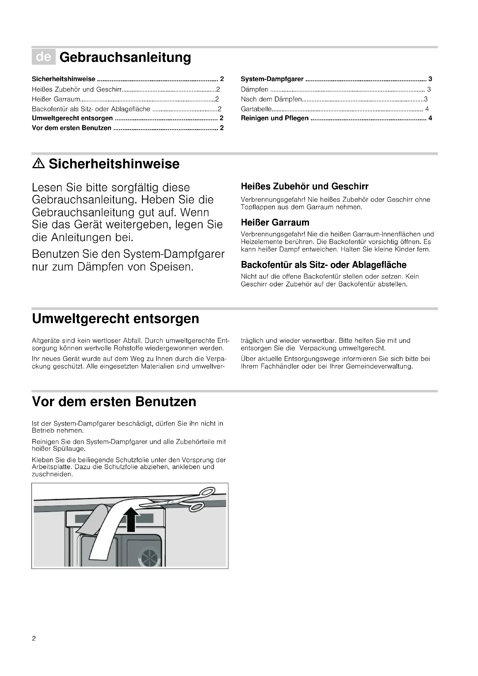 - Reinigen und Pflegen ã=Sicherheitshinweise Lesen Sie bitte sorgfältig diese Gebrauchsanleitung. Heben Sie die Gebrauchsanleitung gut auf. Wenn Sie das Gerät weitergeben, legen Sie die Anleitungen bei. Benutzen Sie den System-Dampfgarer nur zum Dämpfen von Speisen. Heißes Zubehör und Geschirr Verbrennungsgefahr! Nie heißes Zubehör oder Geschirr ohne Topflappen aus dem Garraum nehmen. Heißer Garraum Verbrennungsgefahr! Nie die heißen Garraum-Innenflächen und Heizelemente berühren. Die Backofentür vorsichtig öffnen. Es kann heißer Dampf entweichen. Halten Sie kleine Kinder fern. Backofentür als Sitz- oder Ablagefläche Nicht auf die offene Backofentür stellen oder setzen. Kein Geschirr oder Zubehör auf der Backofentür abstellen. Umweltgerecht entsorgen Altgeräte sind kein wertloser Abfall. Durch umweltgerechte Ent- sorgung können wertvolle Rohstoffe wiedergewonnen werden. Ihr neues Gerät wurde auf dem Weg zu Ihnen durch die Verpa- ckung geschützt. Alle eingesetzten Materialien sind umweltver- träglich und wieder verwertbar. Bitte helfen Sie mit und entsorgen Sie die Verpackung umweltgerecht. Über aktuelle Entsorgungswege informieren Sie sich bitte bei Ihrem Fachhändler oder bei Ihrer Gemeindeverwaltung. Vor dem ersten Benutzen Ist der System-Dampfgarer beschädigt, dürfen Sie ihn nicht in Betrieb nehmen. Reinigen Sie den System-Dampfgarer und alle Zubehörteile mit heißer Spüllauge. Kleben Sie die beiliegende Schutzfolie unter den Vorsprung der Arbeitsplatte. Dazu die Schutzfolie abziehen, ankleben und zuschneiden.3 System-Dampfgarer Die Basis des System-Dampfgarers bildet immer die Auflauf-pfanne, der große Dämpfeinsatz und der Glasdeckel.Für größere Mengen und zur Zubereitung von Reis oder Soßen können Sie zusätzlich das Gestell mit den Garbehältern verwen- den. Verwenden Sie nur die mitgelieferten Originalteile.Weitere Angaben zum Dampfgaren finden Sie in der beiliegen-den Broschüre.Die Auflaufpfanne können Sie auch einzeln z.B. für die Zuberei-tung von großen Auflaufmengen verwenden. Dämpfen Öffnen Sie während des Garvorganges nicht den Backofen. Ausnahme: Beim Kombinieren von verschiedenem Gargut mit großen Unterschieden in den Garzeiten.Die Garzeit wird durch die Größe des Gargutes bestimmt. Bei gleichzeitigem Garen von Lebensmitteln mit unterschiedlichen Garzeiten gilt:■ Schneiden Sie die Lebensmittel mit der längeren Garzeit in kleinere Stücke■ Verlängern Sie die Garzeit für empfindliche Lebensmittel, indem Sie größere Stücke garenGrundsätzlich wird zum Dämpfen 500 ml Wasser (kein destil-liertes Wasser) verwendet. Ausnahme: Quellende Lebensmittel (z.B. Kartoffeln) und Zutaten mit langen Garzeiten benötigen 750 ml Wasser (siehe Gartabelle oder beiliegende Broschüre).1. Heizen Sie den Backofen 10 Minuten bei 150°C Unterhitze $ oder mit der Dampfgarstufe é vor. 2. Geben Sie das Wasser in die Auflaufpfanne.3. Bestücken Sie den System-Dampfgarer mit dem Gargut.4. Setzen Sie den Glasdeckel so auf, dass er umlaufend auf der Auflaufpfanne aufliegt.5. Schieben Sie den System-Dampfgarer in Höhe 1 ein. ã=Verbrühungsgefahr! Beim Öffnen des Backofens kann heißer Dampf entweichen. Öffnen Sie den Backofen nach dem Garvorgang vorsichtig.6. Nehmen Sie den System-Dampfgarer nach Ablauf der Garzeit aus dem Backofen. Verwenden Sie hierzu geeignete Topflap- pen. p. 4