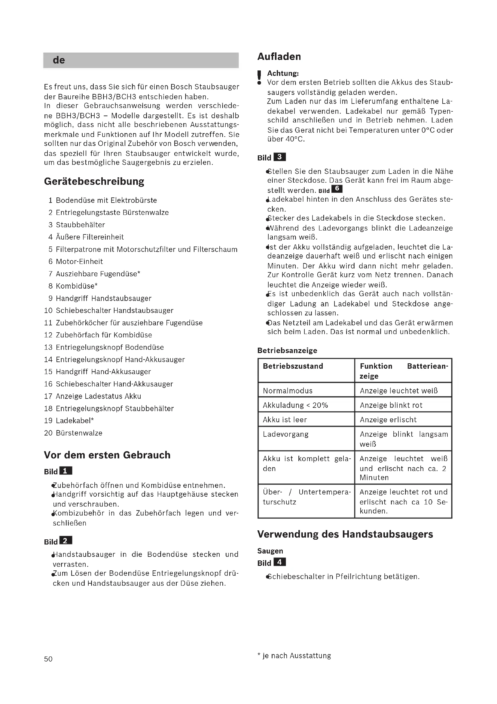 Es freut uns, dass Sie sich für einen Bosch Staubsauger der Baureihe BBH3/BCH3 entschieden haben. In dieser Gebrauchsanweisung werden verschiede- ne BBH3/BCH3 – Modelle dargestellt. Es ist deshalb möglich, dass nicht alle beschriebenen Ausstattungs- merkmale und Funktionen auf Ihr Modell zutreffen. Sie sollten nur das Original Zubehör von Bosch verw enden, das speziell für Ihre n Staubsauger entwickelt wurde, um das bestmögliche Saugergebnis zu erzielen. Gerätebeschreibung 1 Bodendüse mit Elektrobürste 2 Entriegelungstaste Bürstenwalze 3 Staubbehälter 4 Äußere Filtereinheit 5 Filterpatrone mit Motorschutzfilter und Filterschaum 6 Motor-Einheit 7 Ausziehbare Fugendüse* 8 Kombidüse* 9 Handgriff Handstaubsauger 10 Schiebeschalter Handstaubsauger 11 Zubehörköcher für ausziehbare Fugendüse 12 Zubehörfach für Kombidüse 13 Entrieg elungsknopf Bodendüse 14 Entriegelungsknopf Hand-Akkusauger 15 Handgriff Hand-Akkusauger 16 Schiebeschalter Hand-Akkusauger 17 Anzeige Ladestatus Akku 18 Entriegelungsknopf Staubbehälter 19 Ladekabel* 20 Bürstenwalze Vor dem ersten Gebrauch Bild