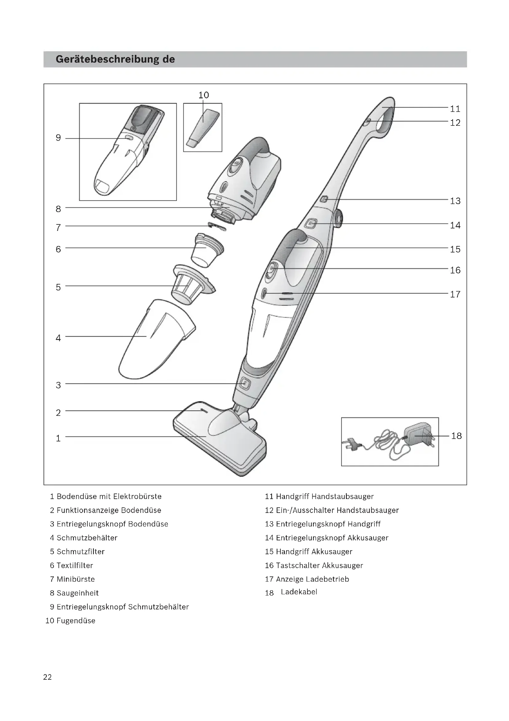 Gerätebeschreibung de 1 Bodendüse mit Elektrobürste 2 Funktionsanzeige Bodendüse 3 Entriegelungsknopf Bodendüse 4 Schmutzbehälter 5 Schmutzfilter 6 Textilfilter 7 Minibürste 8 Saugeinheit 9 Entriegelungsknopf Schmutzbehälter 10 Fugendüse 11 Handgriff Handstaubsauger 12 Ein-/Ausschalter Handstaubsauger 13 Entriegelungsknopf Handgriff 14 Entriegelungsknopf Akkusauger 15 Handgriff Akkusauger 16 Tastschalter Akkusauger 17 Anzeige Ladebetrieb 18 Ladestation 19 Bodenhalterung Ladestation 18 Ladekabel