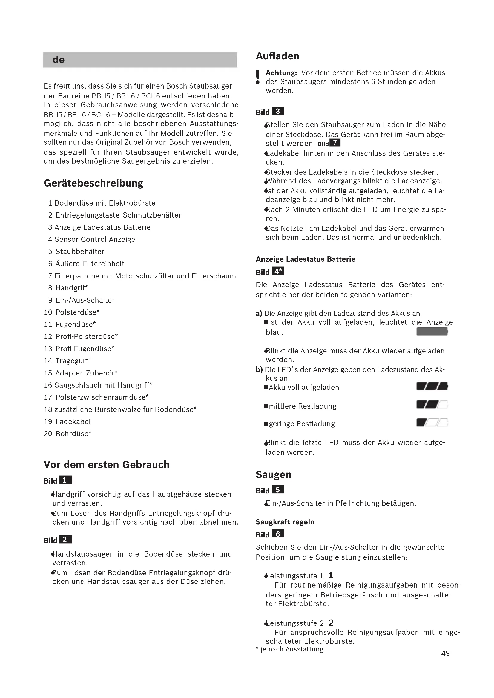 Es freut uns, dass Sie sich für einen Bosch Staubsauger der Baureihe BBH5 / BBH6 / BCH6 entschieden haben. In dieser Gebrauchsanweisung werden verschiedene BBH5 / BBH6 / BCH6 – Modelle dargestellt. Es ist deshalb möglich, dass nicht alle beschriebenen Ausstattungs- merkmale und Funktionen auf Ihr Modell zutreffen. Sie sollten nur das Original Zubehör von Bosch verwenden, das speziell für Ihren Staubsauger entwickelt wurde, um das bestmögliche Saugergebnis zu erzielen. Gerätebeschreibung 1 Bodendüse mit Elektrobürste 2 Entriegelungstaste Schmutzbehälter 3 Anzeige Ladestatus Batterie 4 Sensor Control Anzeige 5 Staubbehälter 6 Äußere Filtereinheit 7 Filterpatrone mit Motorschutzfilter und Filterschaum 8 Handgriff 9 Ein-/Aus-Schalter 10 Polsterdüse* 11 Fugendüse* 12 Profi-Polsterdüse* 13 Profi-Fugendüse* 14 Tragegurt* 15 Adapter Zubehör* 16 Saugschlauch mit Handgriff* 17 Polsterzwischenraumdüse* 18 zusätzliche Bürstenwalze für Bodendüse* 19 Ladekabel 20 Bohrdüse* Vor dem ersten Gebrauch Bild