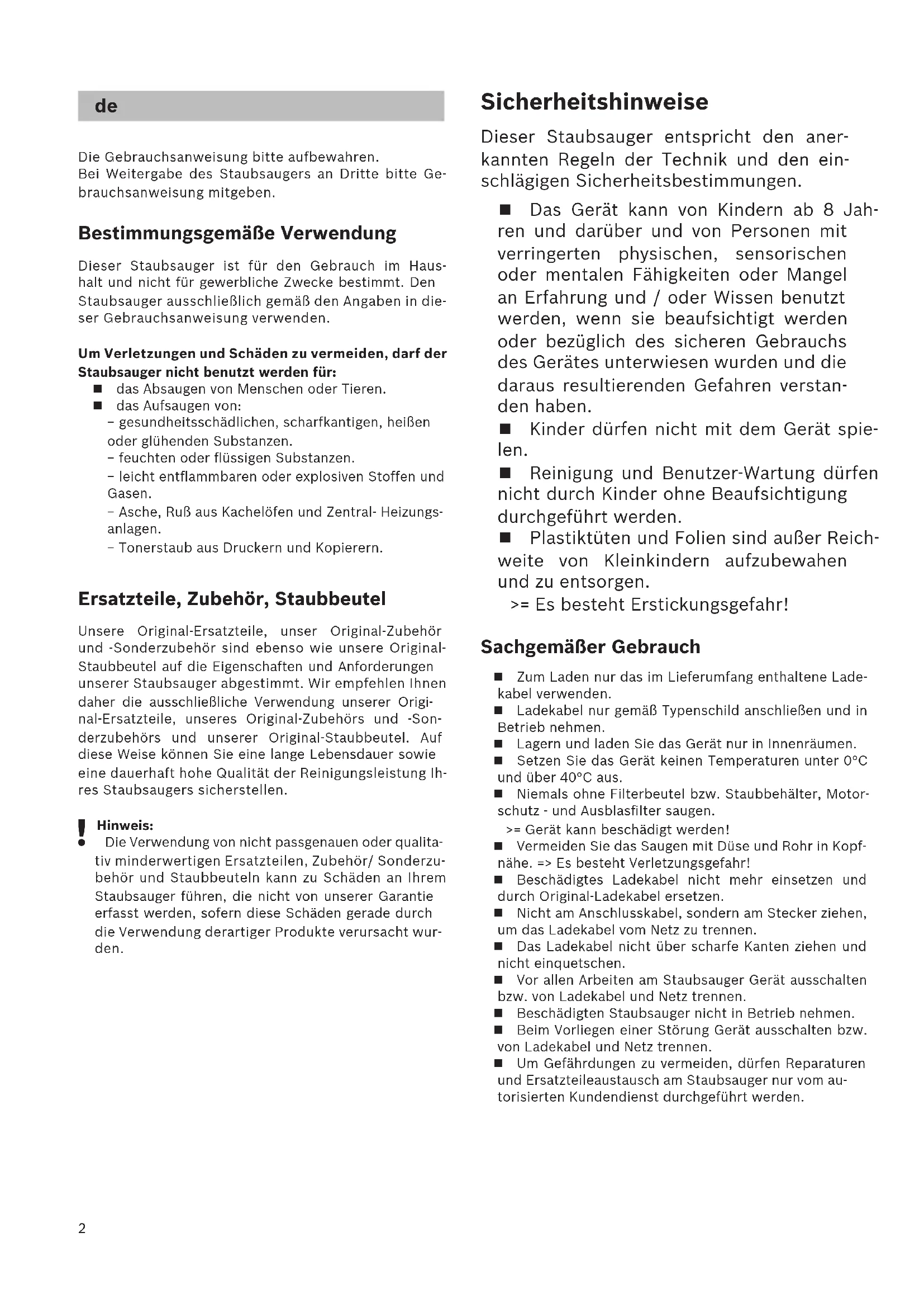 Hinweis: Die Verwendung von nicht passgenauen oder qualita- tiv minderwertigen Ersatzteilen, Zubehör/ Sonderzu- behör und Staubbeuteln kann zu Schäden an Ihrem Staubsauger führen, die nicht von unserer Garantie erfasst werden, sofern diese Schäden gerade durch die Verwendung derartiger Produkte verursacht wur- den. Sicherheitshinweise Dieser Staubsauger entspricht den aner- kannten Regeln der Technik und den ein- schlägigen Sicherheitsbestimmungen. Das Gerät kann von Kindern ab 8 Jah- ren und darüber und von Personen mit verringerten physischen, sensorischen oder mentalen Fähigkeiten oder Mangel an Erfahrung und / oder Wissen benutzt werden, wenn sie beaufsichtigt werden oder bezüglich des sicheren Gebrauchs des Gerätes unterwiesen wurden und die daraus resultierenden Gefahren verstan- den haben. Kinder dürfen nicht mit dem Gerät spie- len. Reinigung und Benutzer-Wartung dürfen nicht durch Kinder ohne Beaufsichtigung durchgeführt werden. Plastiktüten und Folien sind außer Reich- weite von Kleinkindern aufzubewahen und zu entsorgen. >= Es besteht Erstickungsgefahr! Sachgemäßer Gebrauch Zum Laden nur das im Lieferumfang enthaltene Lade- kabel verwenden. Ladekabel nur gemäß Typenschild anschließen und in Betrieb nehmen. Lagern und laden Sie das Gerät nur in Innenräumen. Setzen Sie das Gerät keinen Temperaturen unter 0°C und über 40°C aus. Niemals ohne Filterbeutel bzw. Staubbehälter, Motor- schutz - und Ausblasfilter saugen. >= Gerät kann beschädigt werden! Vermeiden Sie das Saugen mit Düse und Rohr in Kopf- nähe. => Es besteht Verletzungsgefahr! Beschädigtes Ladekabel nicht mehr einsetzen und durch Original-Ladekabel ersetzen. Nicht am Anschlusskabel, sondern am Stecker ziehen, um das Ladekabel vom Netz zu trennen. Das Ladekabel nicht über scharfe Kanten ziehen und nicht einquetschen. Vor allen Arbeiten am Staubsauger Gerät ausschalten bzw. von Ladekabel und Netz trennen. Beschädigten Staubsauger nicht in Betrieb nehmen. Beim Vorliegen einer Störung Gerät ausschalten bzw. von Ladekabel und Netz trennen. Um Gefährdungen zu vermeiden, dürfen Reparaturen und Ersatzteileaustausch am Staubsauger nur vom au- torisierten Kundendienst durchgeführt werden. de3 In folgenden Fällen ist das Gerät sofort außer Betrieb zu nehmen und der Kundendienst zu kontaktieren: − wenn Sie versehentlich Flüssigkeit aufgesaugt haben oder Flüssigkeit in das Innere des Gerätes gekommen ist − wenn das Gerät heruntergefallen und beschädigt ist. Staubsauger vor Witterungseinflüssen, Feuchtigkeit und Hitzequellen schützen. Keine brennbaren oder alkoholhaltigen Stoffe auf die Filter (Filterbeutel, Motorschutzfilter, Ausblasfilter etc.) geben. Staubsauger ist für den Baustellenbetrieb nicht geeig- net. =>Einsaugen von Bauschutt kann zur Beschädi- gung des Gerätes führen. Gerät ausschalten, wenn nicht gesaugt wird. Die Verpackung schützt den Staubsauger vor Beschä- digung auf dem Transport. Deshalb empfehlen wir, die Verpackung für Transportzwecke aufzubewahren. Batterien Ihr Gerät ist mit Lithium Ionen Akkus ausgestattet, die aus Sicherheitsgründen nur professionellen Reparatur- Fachleuten zugänglich sind. Bitte wenden Sie sich zum Austausch der Akkus an das nächstgelegene Kundendienstcenter oder den autori- sierten Fachhändler. Hinweise zur Entsorgung Verpackung Die Verpackung schützt den Staubsauger vor Be- schädigung auf dem Transport. Sie besteht aus umweltfreundlichen Materialien und ist deshalb recycelbar. Entsorgen Sie nicht mehr benötigte Ver- packungsmaterialien an den Sammelstellen für das Verwertungssystem »Grüner Punkt«. Altgerät Dieses Gerät enthält wieder aufladbare Lithium Io- nen Akkus. Deshalb darf das Gerät nur über den au- torisierten Kundendienst und Fachhandel entsorgt werden. Please keep this instruction manual for future refe- rence. When passing the vacuum cleaner on to a third party, please also pass on this instruction manual. Intended use This appliance is intended for domestic use only, not for commercial use. Only use this vacuum cleaner in accordance with the information provided in this ins- truction manual. In order to prevent injuries and damage, the vacuum cleaner must not be used for: Vacuuming persons or animals. Vacuuming up: − Hazardous, sharp-edged, hot or red-hot substances. − Damp or liquid substances. − Highly flammable or explosive substances and gases. − Ash, soot from tiled stoves and central heating systems. − Toner dust from printers and copiers. Spare parts, accessories, dust bags Our original spare parts, original (special) accessories and original dust bags are designed to work with the features and requirements of our vacuum cleaners. We therefore recommend that you only use our original spa- re parts, original (special) accessories and original dust bags. This will ensure that your vacuum cleaner has a long service life and that the quality of its cleaning per- formance will remain consistently high throughout.