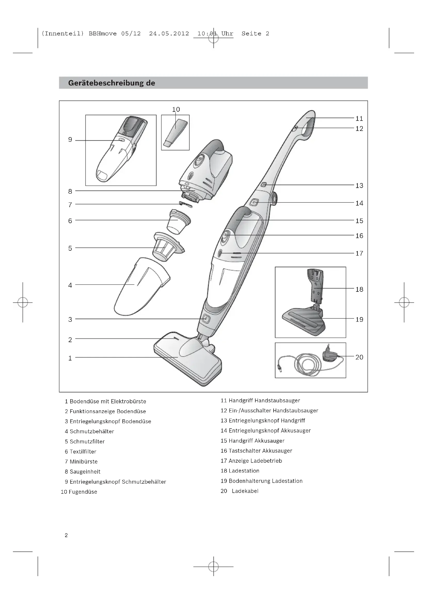 (Innenteil) BBHmove 05/12 24.05.2012 10:01 Uhr Seite 2de (Innenteil) BBHmove 05/12 24.05.2012 10:01 Uhr Seite 3 Die Gebrauchsanweisung bitte aufbewahren.Bei Wei- tergabe des Staubsaugers an Dritte bitte Gebrauchs- anweisung mitgeben. Bestimmungsgemäße Verwendung Dieses Gerät ist für den Haushalt oder in haushaltsähn- lichen, nicht- gewerblichen Anwendungen bestimmt. Haushaltsähnliche Anwendungen umfassen z. B. die Verwendung in Mitarbeiterräumen von Läden, Büros, landwirtschaftlichen und anderen gewerblichen Be- trieben, sowie die Nutzung durch Gäste von Pensionen, kleinen Hotels und ähnlichen Wohneinrichtungen. Die- ses Gerät ist für eine Nutzung bis zu einer Höhe von ma- ximal 2000 Metern über dem Meeresspiegel bestimmt. Den Staubsauger ausschließlich gemäß den Angaben in dieser Gebrauchsanweisung verwenden. Der Staubsauger darf nur bedient werden mit: Original-Filtereinsätzen Original-Ersatzteilen, -Zubehör Der Staubsauger ist nicht geeignet für: das Absaugen von Menschen oder Tieren das Aufsaugen von: − gesundheitsschädlichen, scharfkantigen, heißen oder glühenden Substanzen − feuchten oder flüssigen Substanzen − leicht entflammbaren oder explosiven Stoffen und Gasen − Asche, Ruß aus Kachelöfen und Zentral-Heizungs- anlagen. Sicherheitshinweise Dieser Staubsauger entspricht den aner- kannten Regeln der Technik und den ein- schlägigen Sicherheitsbestimmungen. Das Gerät kann von Kindern ab 8 Jah- ren und darüber und von Personen mit verringerten physischen, sensorischen oder mentalen Fähigkeiten oder Mangel an Erfahrung und / oder Wissen benutzt werden, wenn sie beaufsichtigt werden oder bezüglich des sicheren Gebrauchs des Gerätes unterwiesen wurden und die daraus resultierenden Gefahren verstan- den haben. Kinder dürfen nicht mit dem Gerät spie- len. Reinigung und Benutzer-Wartung dürfen nicht durch Kinder ohne Beaufsichtigung durchgeführt werden. Plastiktüten und Folien sind außer Reich- weite von Kleinkindern aufzubewahren und zu entsorgen. >= Es besteht Erstickungsgefahr! Sachgemäßer Gebrauch Ladegerät nur gemäß Typenschild anschließen und in Betrieb nehmen. Niemals ohne Filtereinsätze saugen.=> Gerät kann be- schädigt werden! Nicht am Netzanschlusskabel, sondern am Stecker zie- hen, um das Ladegerät vom Netz zu trennen. Laden Sie das Gerät nicht bei Temperaturen unter 0°C oder über 40°C. Defektes Ladegerät nicht anschließen oder öffnen, sondern gegen neues tauschen. Beschädigten Akkusauger nicht in Betrieb nehmen. Um Gefährdungen zu vermeiden, dürfen Reparaturen und Ersatzteilaustausch, soweit sie nicht unter »Rei- nigung « in dieser Gebrauchsanweisung beschrieben sind, nur vom autorisierten Kundendienst durchge- führt werden. Staubsauger und Ladestation vor Witterungseinflüs- sen, Feuchtigkeit und Hitzequellen schützen. Ausgediente Geräte sofort unbrauchbar machen, da- nach das Gerät einer ordnungsgemäßen Entsorgung zuführen. Hinweise zur Entsorgung Über aktuelle Entsorgungswege informieren Sie sich bitte bei Ihrem Fachhändler oder bei Ihrer Gemeinde- verwaltung. Achtung: Dieses Gerät enthält wieder auf- ladbare NiMH-Batterien (Akkus). Vor der Entsorgung des Gerätes die entladenen Batterien ausbauen (siehe Bilder 15) und umweltgerecht entsorgen.