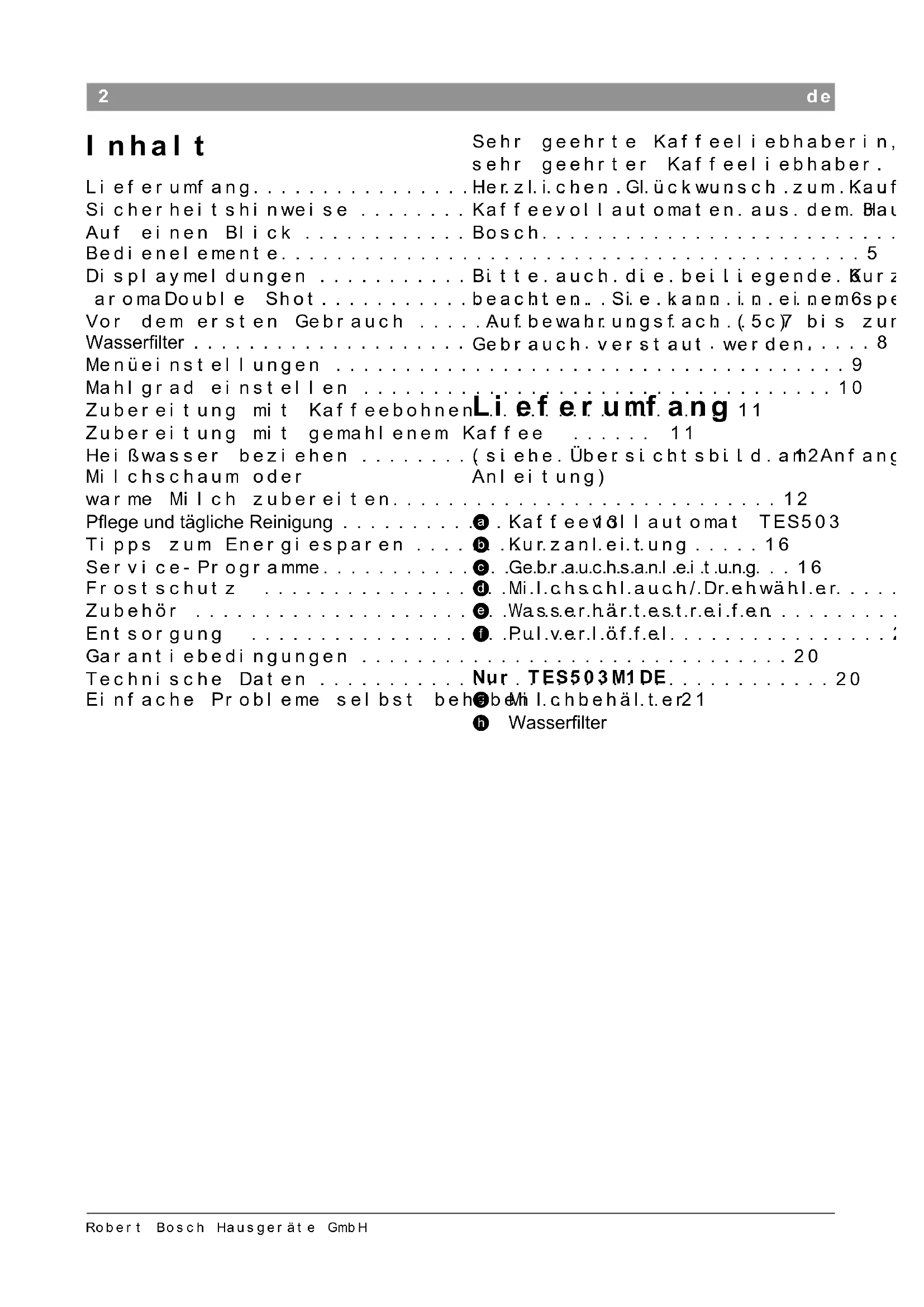 de Deutsch 2 en English 23 fr Français 43 it Italiano 64 Lieferumfang (siehe Seite 2) Included in delivery (see page 23) Contenu de l’emballage (voir page 43) Contenuto della confezione (ved. pagina 64)2 de Robert Bosch Hausgeräte GmbH Sehr geehrte Kaffeeliebhaberin, sehr geehrter Kaffeeliebhaber. Herzlichen Glückwunsch zum Kauf dieses Kaffeevollautomaten aus dem Hause Bosch. Bitte auch die beiliegende Kurzanleitung beachten. Sie kann in einem speziellen Aufbewahrungsfach (5c) bis zum nächsten Gebrauch verstaut werden. Lieferumfang (siehe Übersichtsbild am Anfang der Anleitung) a Kaffeevollautomat TES503 b Kurzanleitung c Gebrauchsanleitung d Milchschlauch/Drehwähler e Wasserhärtestreifen f Pulverlöffel Nur TES503M1DE g Milchbehälter