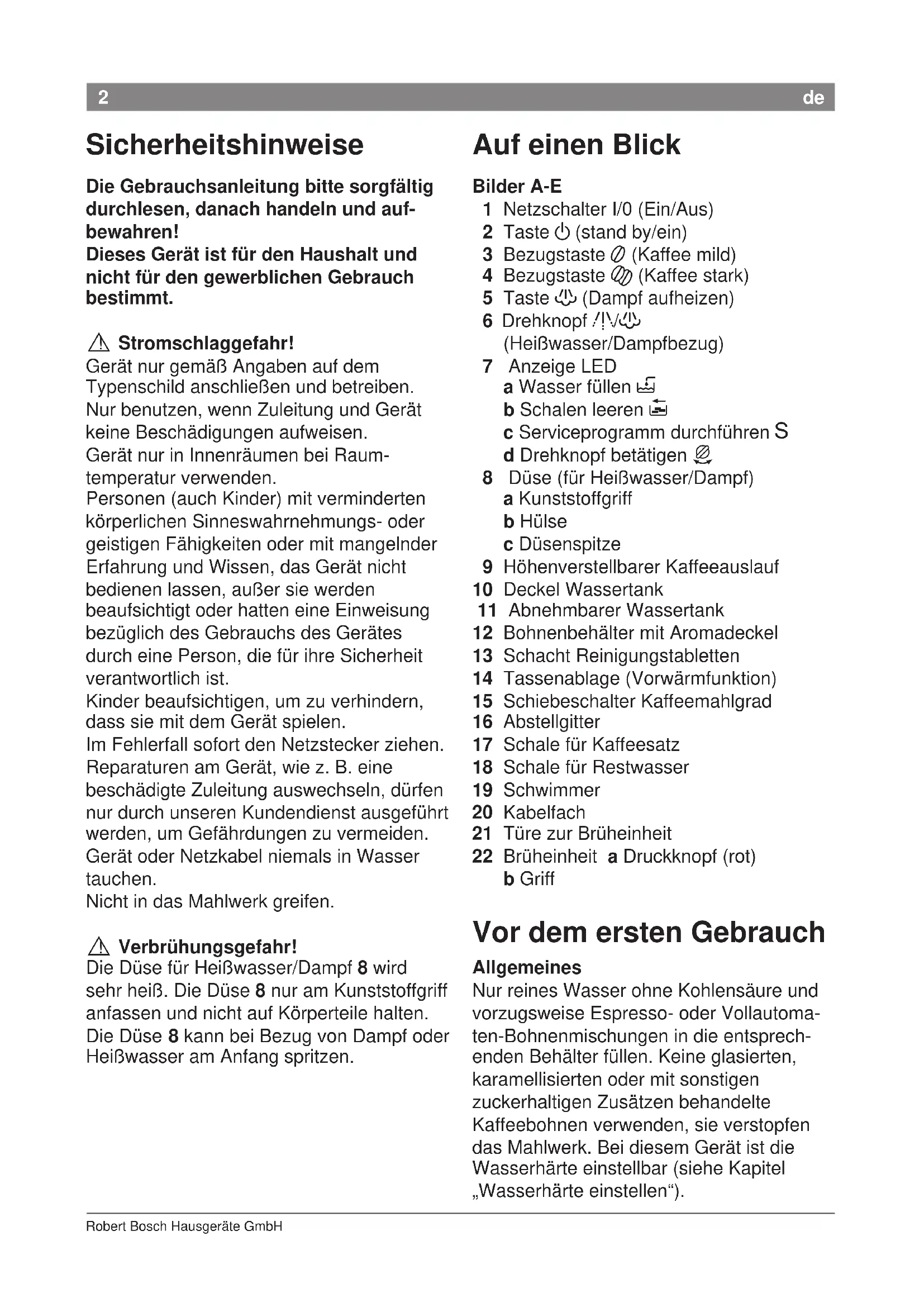! Verbrühungsgefahr! Die Düse für Heißwasser/Dampf 8 wird sehr heiß. Die Düse 8 nur am Kunststoffgriff anfassen und nicht auf Körperteile halten. Die Düse 8 kann bei Bezug von Dampf oder Heißwasser am Anfang spritzen. Auf einen Blick Bilder A-E 1 Netzschalter I/0 (Ein/Aus) 2 Taste a (stand by/ein) 3 Bezugstaste 5 (Kaffee mild) 4 Bezugstaste K (Kaffee stark) 5 Taste h (Dampf aufheizen) 6 Drehknopf g/h (Heißwasser/Dampfbezug) 7 Anzeige LED a Wasser füllen H b Schalen leeren I c Serviceprogramm durchführen S d Drehknopf betätigen J 8 Düse (für Heißwasser/Dampf) a Kunststoffgriff b Hülse c Düsenspitze 9 Höhenverstellbarer Kaffeeauslauf 10 Deckel Wassertank 11 Abnehmbarer Wassertank 12 Bohnenbehälter mit Aromadeckel 13 Schacht Reinigungstabletten 14 Tassenablage (Vorwärmfunktion) 15 Schiebeschalter Kaffeemahlgrad 16 Abstellgitter 17 Schale für Kaffeesatz 18 Schale für Restwasser 19 Schwimmer