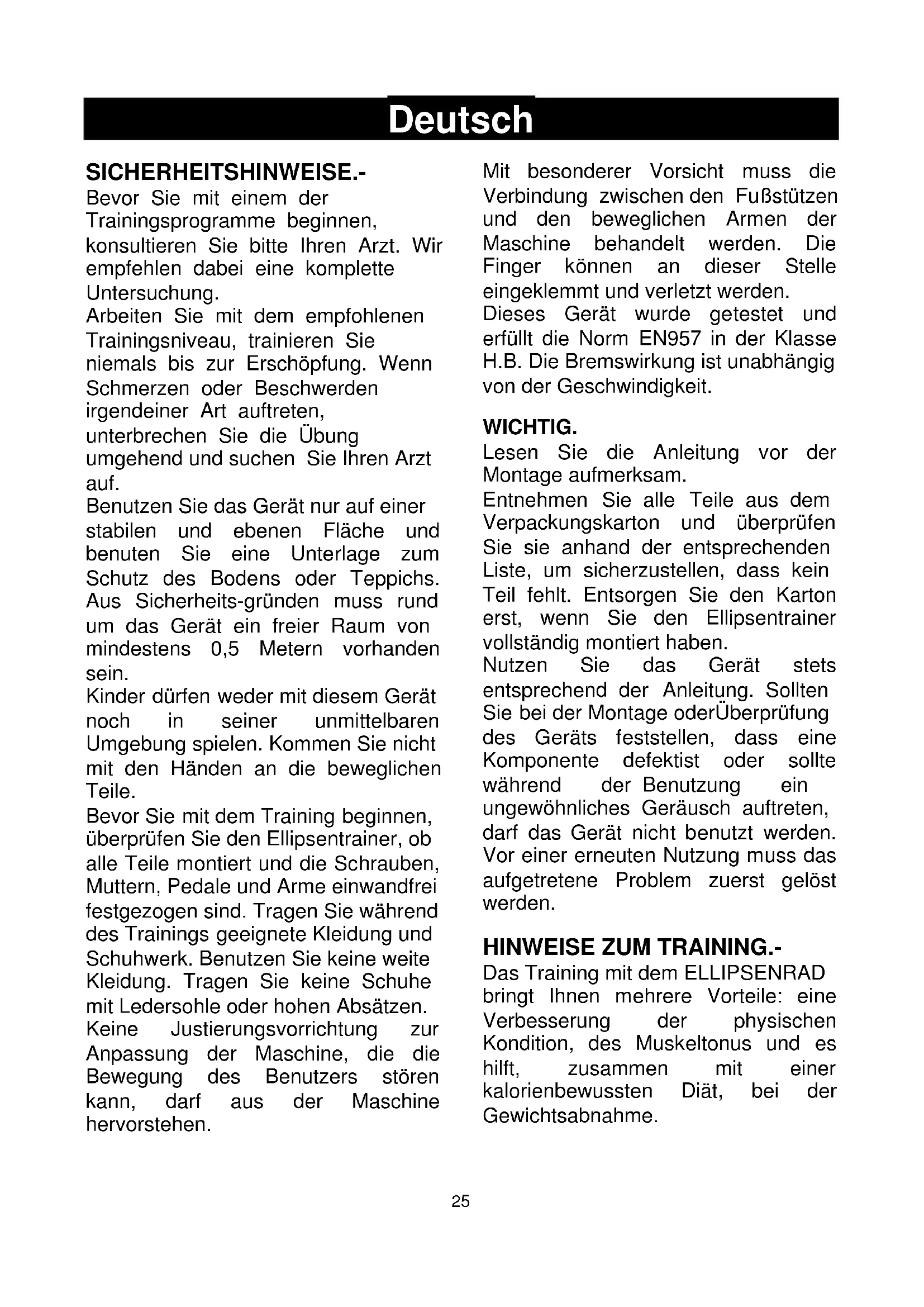 Bevor Sie mit dem Training beginnen, überprüfen Sie den Ellipsentrainer, ob alle Teile montiert und die Schrauben, Mattern, Pedale und Arme einwandfrei festgezogen sind. Tragen Sie während des Trainings geeignete Kleidung und Schuhwerk. Benutzen Sie keine weite Kleidung. Tragen Sie keine Schuhe mit Ledersohle oder hohen Absätzen. Keine Justierungsvorrichtung zur Anpassung der Maschine, die die Bewegung des Benutzers stären kann, daß aus der Maschine hervorstehen.