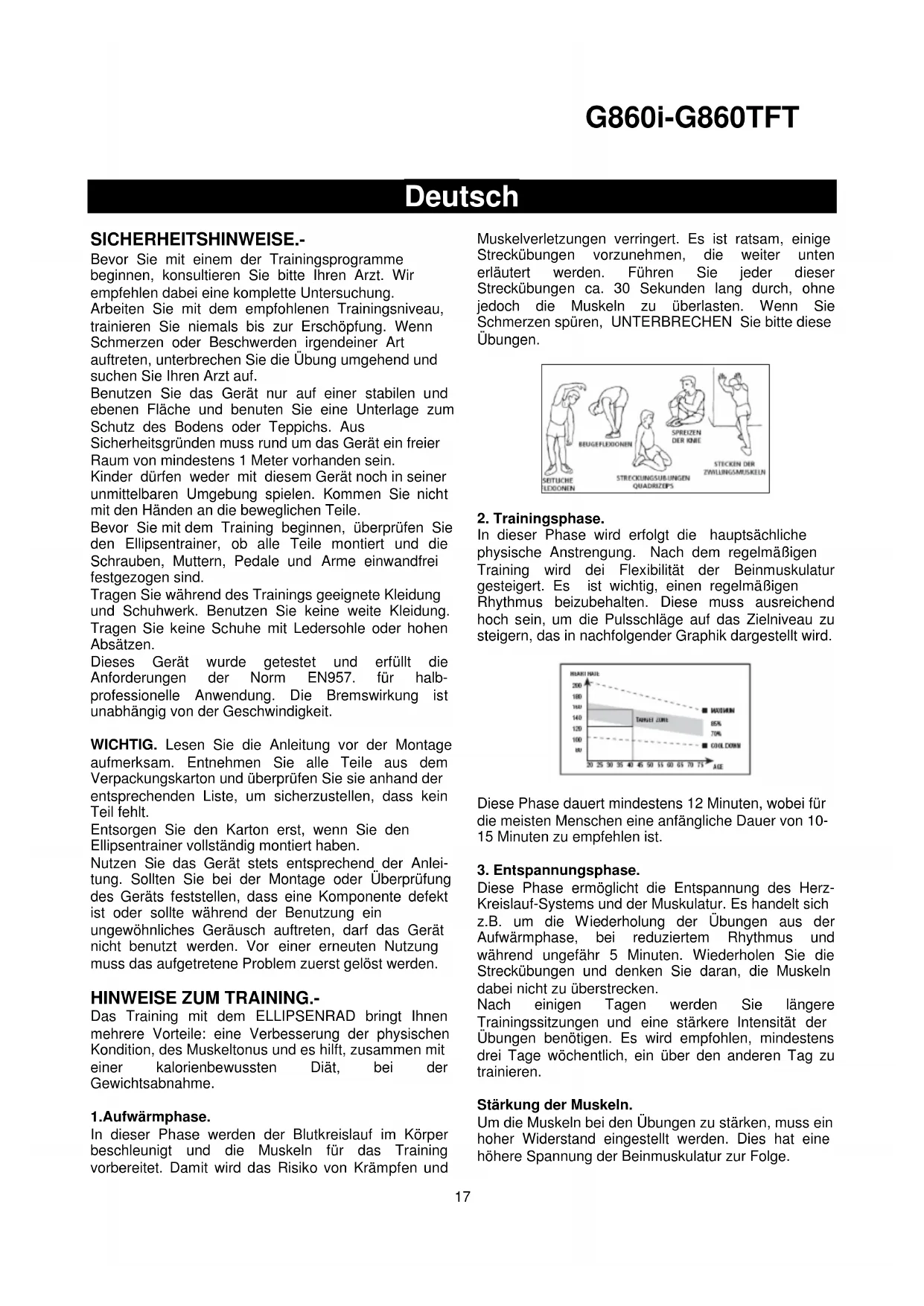 Arbeiten Sie mit dem empfohlenen Trainingsniveau, trainieren Sie niemals bis zur Erschöpfung. Wenn Schmerzen oder Beschwerden irgendeiner Art auftreten, unterbrechen Sie die Übung umgehend und suchen Sie Ihren Arzt auf.