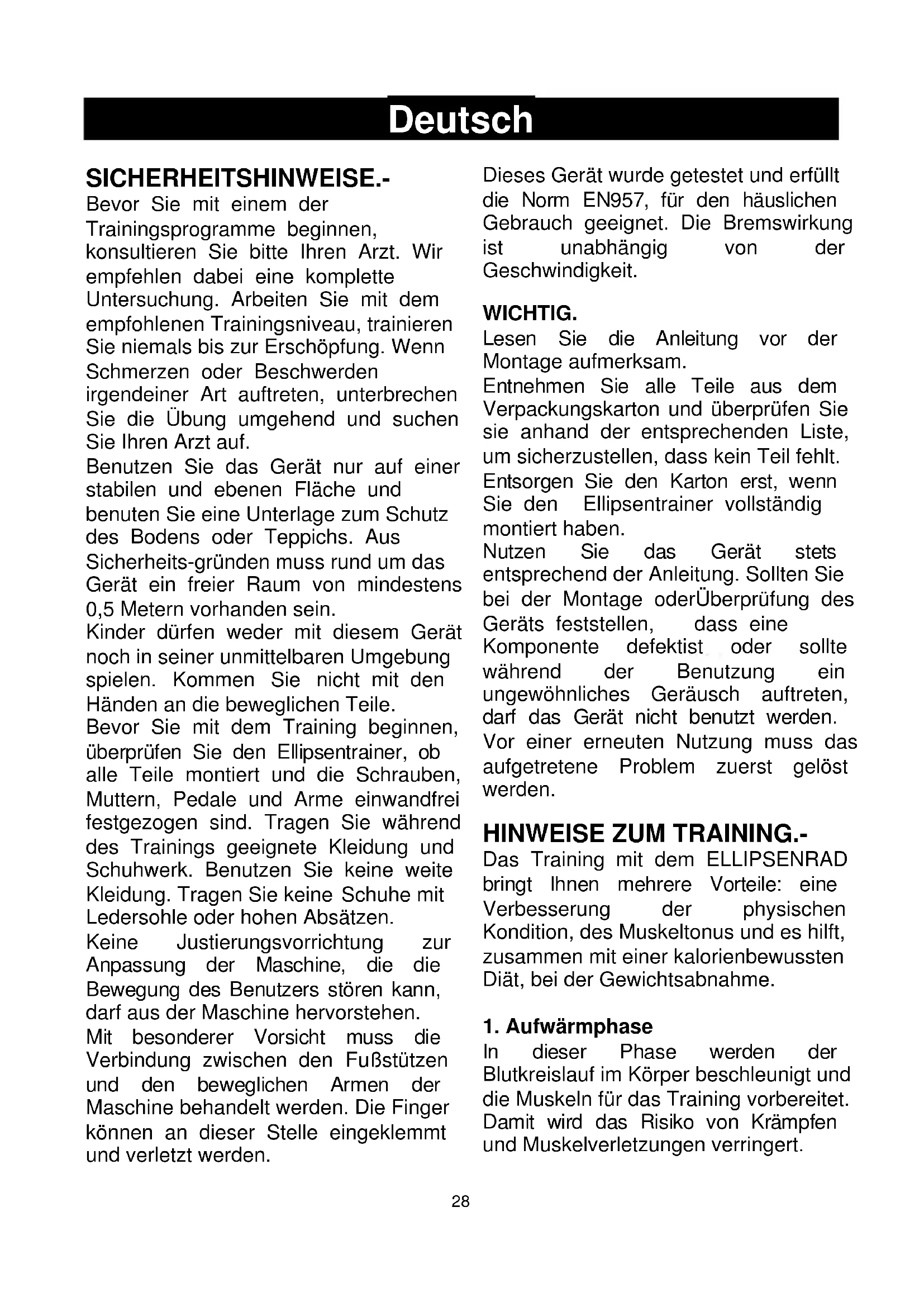Deutsch SICHERHEITSHINWEISE.- Bevor Sie mit einem der Trainingsprogramme beginnen, konsultieren Sie bitte Ihren Arzt. Wir empfehlen dabei eine komplette Untersuchung. Arbeiten Sie mit dem empfohlenen Trainingsniveau, trainieren Sie niemals bis zur Erschöpfung. Wenn Schmerzen oder Beschwerden irgendeiner Art auftreten, unterbrechen Sie die Übung umgehend und suchen Sie Ihren Arzt auf. Benutzen Sie das Gerät nur auf einer stabilen und ebenen Fläche und benuten Sie eine Unterlage zum Schutz des Bodens oder Teppichs. Aus Sicherheits-gründen muss rund um das Gerät ein freier Raum von mindestens 0,5 Metern vorhanden sein. Kinder dürfen weder mit diesem Gerät noch in seiner unmittelbaren Umgebung spielen. Kommen Sie nicht mit den Händen an die beweglichen Teile. Bevor Sie mit dem Training beginnen, überprüfen Sie den Ellipsentrainer, ob alle Teile montiert und die Schrauben, Muttern, Pedale und Arme einwandfrei festgezogen sind. Tragen Sie während des Trainings geeignete Kleidung und Schuhwerk. Benutzen Sie keine weite Kleidung. Tragen Sie keine Schuhe mit Ledersohle oder hohen Absätzen. Keine Justierungsvorrichtung zur Anpassung der Maschine, die die Bewegung des Benutzers stören kann, darf aus der Maschine hervorstehen. Mit besonderer Vorsicht muss die Verbindung zwischen den Fußstützen und den beweglichen Armen der Maschine behandelt werden. Die Finger können an dieser Stelle eingeklemmt und verletzt werden. Dieses Gerät wurde getestet und erfüllt die Norm EN957, für den häuslichen Gebrauch geeignet. Die Bremswirkung ist unabhängig von der Geschwindigkeit. WICHTIG. Lesen Sie die Anleitung vor der Montage aufmerksam. Entnehmen Sie alle Teile aus dem Verpackungskarton und überprüfen Sie sie anhand der entsprechenden Liste, um sicherzustellen, dass kein Teil fehlt. Entsorgen Sie den Karton erst, wenn Sie den Ellipsentrainer vollständig montiert haben. Nutzen Sie das Gerät stets entsprechend der Anleitung. Sollten Sie bei der Montage oderÜberprüfung des Geräts feststellen, dass eine Komponente defektist oder sollte während der Benutzung ein ungewöhnliches Geräusch auftreten, darf das Gerät nicht benutzt werden. Vor einer erneuten Nutzung muss das aufgetretene Problem zuerst gelöst werden.