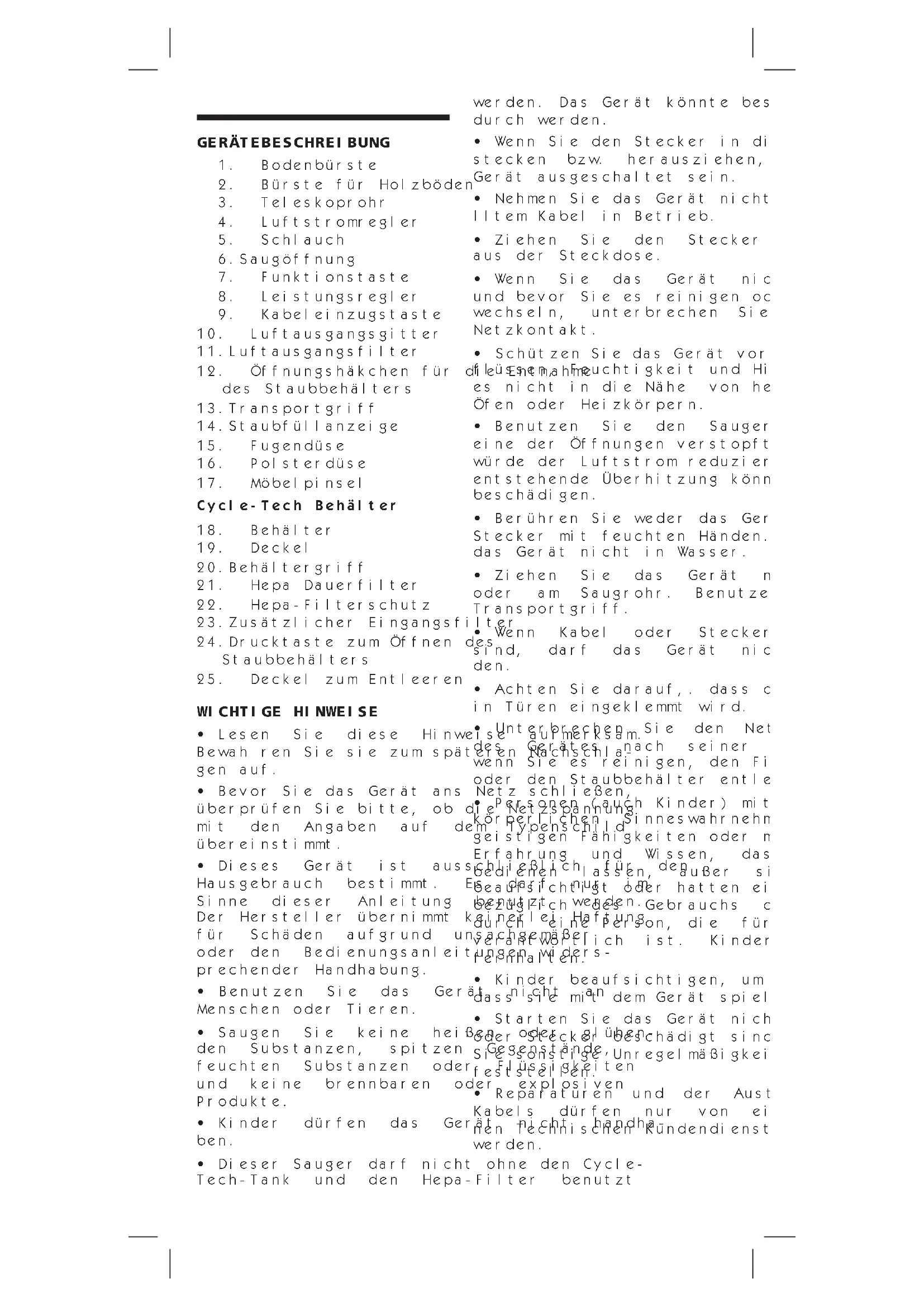 BESEITIGUNG Unsere Waren sind für den Transport mit einer optimierten Verpackungversehen.Diesebestehtprin zipiellausumweltfreundlichenMaterialien, diealssekundäreRohstoffebeidenörtli chenEntsorgungsunternehmenabzugeben sind. Dieses Produkt entspricht den Vorschriften der EURichtlinie 2002/96/CE. DasSymbolderdurchgestrichenen MülltonneaufdemGerätweistda raufhin,dassdasProduktnichtimHausmüll sondern getrennt entsorgt werden muss. Geben Sie es zum Entsorgen in einem ZentrumzurEntsorgungelektrischeroder elektronischerHaushaltsgeräteaboderge benSieesbeiIhremVertriebshändlerab, wenn Sie ein ähnliches Gerät erwerben. DerBenutzerhaftetfürdieEntsorgungdes Geräts in einem Zentrum für Sondermüll. Anderenfallskannergemäßdergeltenden VorschriftenzurAbfallbeseitigungbestraft werden. Wird das nicht mehr benutzte Gerät korrekt der getrennten Entsorgung zugeführt,kannesrecycled,behandeltund ökologischentsorgtwerden.Damitwerden negative Auswirkungen auf Umwelt und GesundheitvermiedenunddasRecycling der Materialien des Produktes gefördert. NähereInformationenzudenbestehenden EntsorgungssystemenerhaltenSiebeiIhren örtlichenEntsorgungsunternehmenoderin demGeschäft,indemSiedasGeräterwor ben haben. Hersteller und Importeure übernehmen die Verantwortung für das Recycling,dieBehandlungunddieökolo gische Entsorgung, entweder direkt oder überöffentlicheEinrichtungen. Ihre Stadt oder Gemeindeverwaltung wirdSiegernüberdieMöglichkeitender Entsorgung nicht mehr benutzter Geräte informieren.MAGYAR A KÉSZÜLÉK LEÍRÁSA 1.Padlókefe 2.Kefefapadlóhoz 3.TeleszkópcsŒ 4.SzívásvezérlŒ 5.TömlŒ 6.Szívónyílás 7.ON/OFFgomb 8.ÁramerŒsségszabályzó 9.KábelfeltekerŒgomb 10.LevegŒkimenetrácsok 11.LevegŒkimenetszırŒk 12.Portartálykioldókapocs 13.Hordozhatófogantyú 14.TartálytelekijelzŒ 15.NyakcsŒvég 16.CsŒvégkárpithoz 17.Bútortartozék Cycle-Tech egység 18.Tartály 19.Fedél 20.Hordozhatófogantyú 21.ÁllandóHEPAszırŒ 22.HEPAszırŒvédŒ 23.TovábbibemenetiszırŒ 24.Tartálykioldógomb 25.KiürítésifedŒ