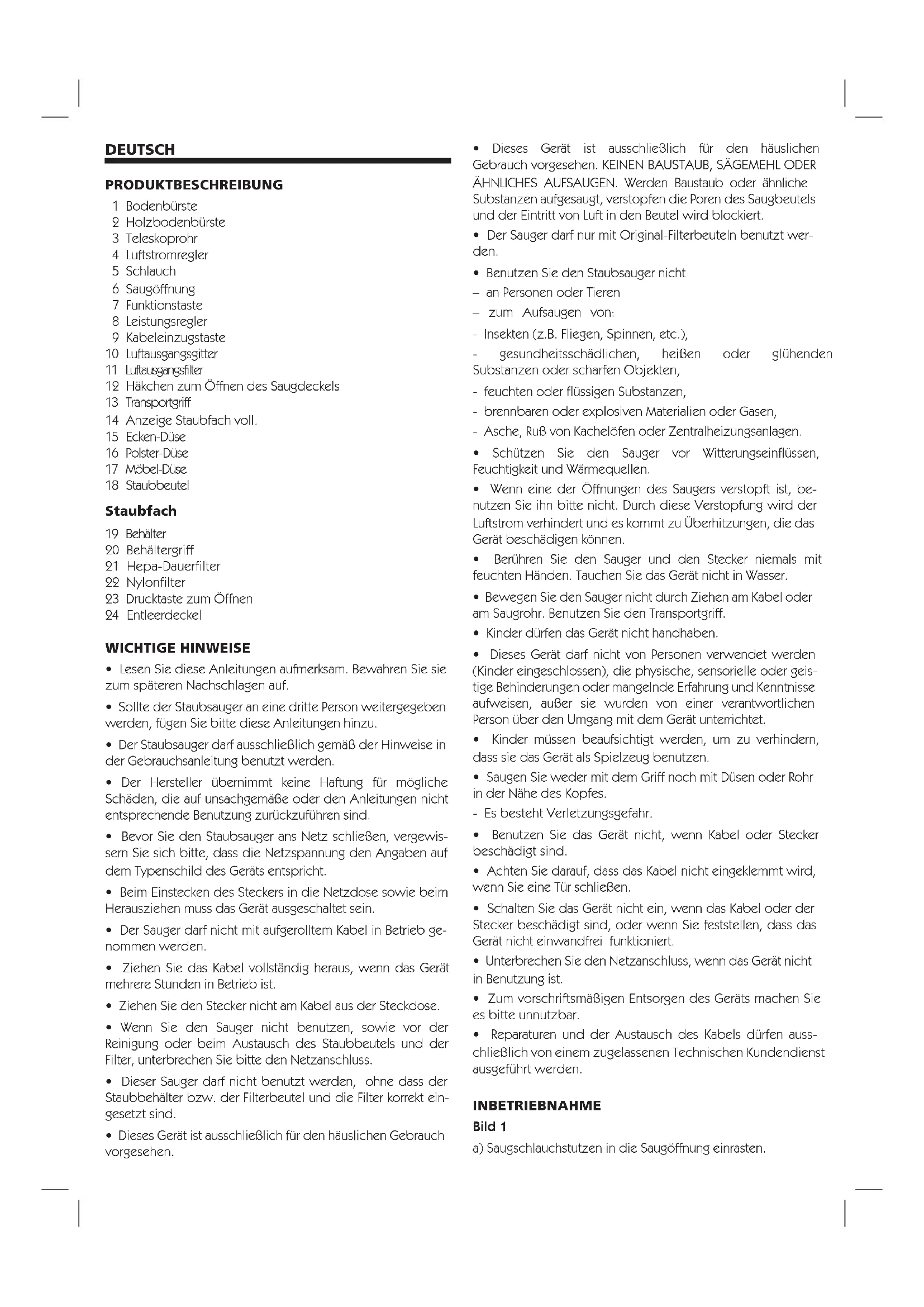 - Reparaturen und der Austausch des Kabels dürfen auss- chließlich von einem zugelassenen Technischen Kundendienst ausgeführt werden. INBETRIEBNAHME Bild 1 a) Saugschlauchstutzen in die Saugöffnung einrasten.b) Zum Herausnehmen des Schlauches, die Befestigungstaste betätigen und das Rohr herausziehen. Bild 2 Handgriff und Saugrohr zusammenstecken. Abbildung 3 Setzen Sie die Bodenbürste auf das Teleskoprohr. Abbildung 4 Entriegeln Sie das Teleskoprohr, indem Sie den Einstellknopf in Pfeilrichtung schieben. Danach stellen Sie die gewünschte Länge ein. Bild 5 Netzanschlusskabel am Stecker greifen, auf die gewünschte Länge herausziehen und Netzstecker einstecken. Bild 6 Staubsauger durch Betätigen der Ein- /Austaste in Pfeilrichtung ein-/ ausschalten. Bild 7 Stellen Sie die gewünschte Leistung mit dem Regler ein. Bild 8 Die Intensität kann mit dem Handgriff eingestellt werden. Wenn Sie den Regler öffnen, verringert sich die Saugleistung, geschlossen verstärkt sie sich. Bild 9 Düsen je nach Bedarf auf Saugrohr oder Handgriff stecken: a) Eckendüse. Lange Düse zum Saugen von Rillen, Ecken, etc. b) Polsterdüse zum Absaugen von Polstermöbeln, Vorhängen, etc. c) Möbeldüse, zum Vermeiden von Schäden an der Möbeloberfläche. Bild 10 Bei kurzen Saugpausen können Sie die Parkhilfe an der Geräterückseite benutzen. Haken an der Bodendüse in die Aussparung an der Geräterückseite schieben. Bild 11 Beim Saugen, z. B. auf Treppen, kann das Gerät auch an beiden Griffen transportiert werden.