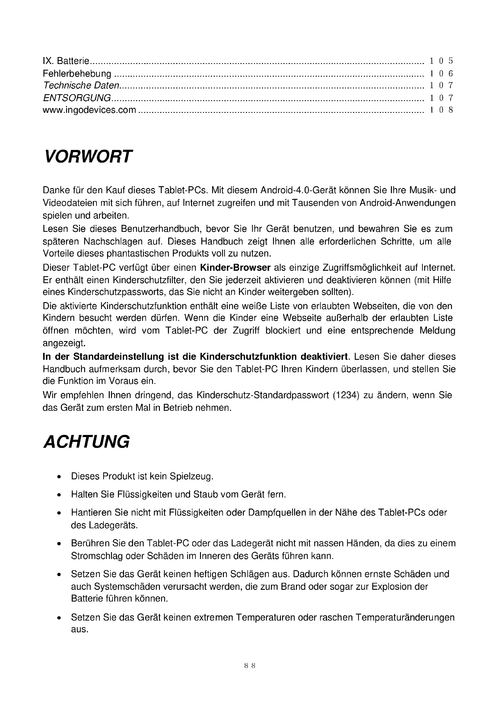 IX. Batterie ............................................................................................................................. 105 Fehlerbehebung .................................................................................................................... 106 Technische Daten .................................................................................................................. 107 ENTSORGUNG ..................................................................................................................... 107 www.ingodevices.com ........................................................................................................... 108 VORWORT Danke für den Kauf dieses Tablet-PCs. Mit diesem Android-4.0-Gerät können Sie Ihre Musik- und Videodateien mit sich führen, auf Internet zugreifen und mit Tausenden von Android-Anwendungen spielen und arbeiten. Lesen Sie dieses Benutzerhandbuch, bevor Sie Ihr Gerät benutzen, und bewahren Sie es zum späteren Nachschlagen auf. Dieses Handbuch zeigt Ihnen alle erforderlichen Schritte, um alle Vorteile dieses phantastischen Produkts voll zu nutzen. Dieser Tablet-PC verfügt über einen Kinder-Browser als einzige Zugriffsmöglichkeit auf Internet. Er enthält einen Kinderschutzfilter, den Sie jederzeit aktivieren und deaktivieren können (mit Hilfe eines Kinderschutzpassworts, das Sie nicht an Kinder weitergeben sollten). Die aktivierte Kinderschutzfunktion enthält eine weiße Liste von erlaubten Webseiten, die von den Kindern besucht werden dürfen. Wenn die Kinder eine Webseite außerhalb der erlaubten Liste öffnen möchten, wird vom Tablet-PC der Zugriff blockiert und eine entsprechende Meldung angezeigt. In der Standardeinstellung ist die Kinderschutzfunktion deaktiviert. Lesen Sie daher dieses Handbuch aufmerksam durch, bevor Sie den Tablet-PC Ihren Kindern überlassen, und stellen Sie die Funktion im Voraus ein. Wir empfehlen Ihnen dringend, das Kinderschutz-Standardpasswort (1234) zu ändern, wenn Sie das Gerät zum ersten Mal in Betrieb nehmen. ACHTUNG