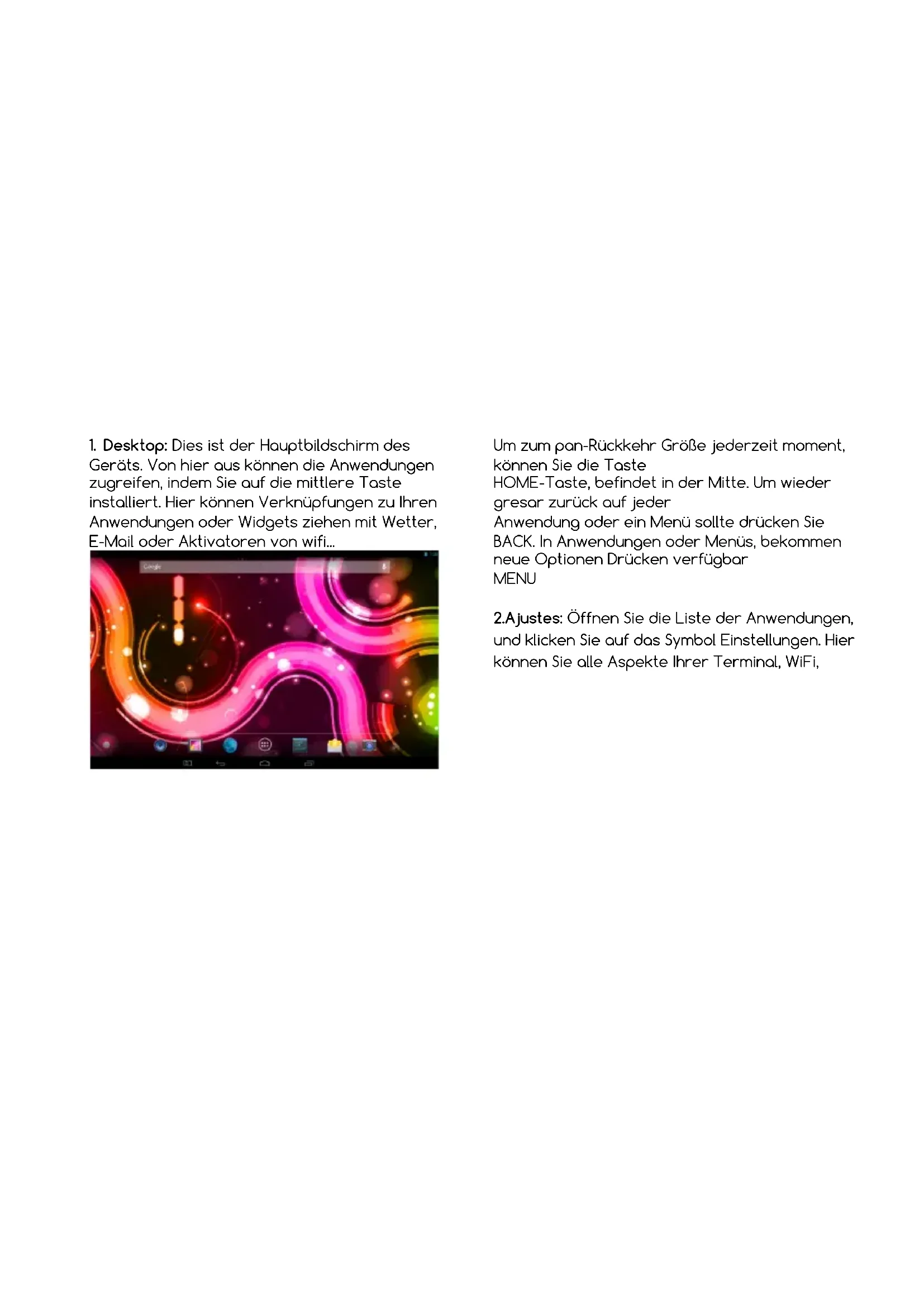 Um zum pan-Rückkehr Größe jederzeit moment, können Sie die Taste HOME-Taste, befindet in der Mitte. Um wieder gresar zurück auf jeder Anwendung oder ein Menü sollte drücken Sie BACK. In Anwendungen oder Menüs, bekommen neue Optionen Drücken verfügbar MENU 2.Ajustes: Öffnen Sie die Liste der Anwendungen, und klicken Sie auf das Symbol Einstellungen. Hier können Sie alle Aspekte Ihrer Terminal, WiFi,Sound, Bildschirm, Zeit-, Sprach ... Um zu einem drahtlosen Netzwerk zu verbinden, tippen Sie auf das wifi Abschnitt, und die Aktivierung der Ecke. Die Bestimmungen tive drahtlose Netzwerke finden ihre Umfang, und kann für die Ko- Verbindung aufnimmt. Sie können das WIFI die Anzeige der oberen Leiste Meldungen Finger nach unten. Es muss schnell Kontrollen wifi...