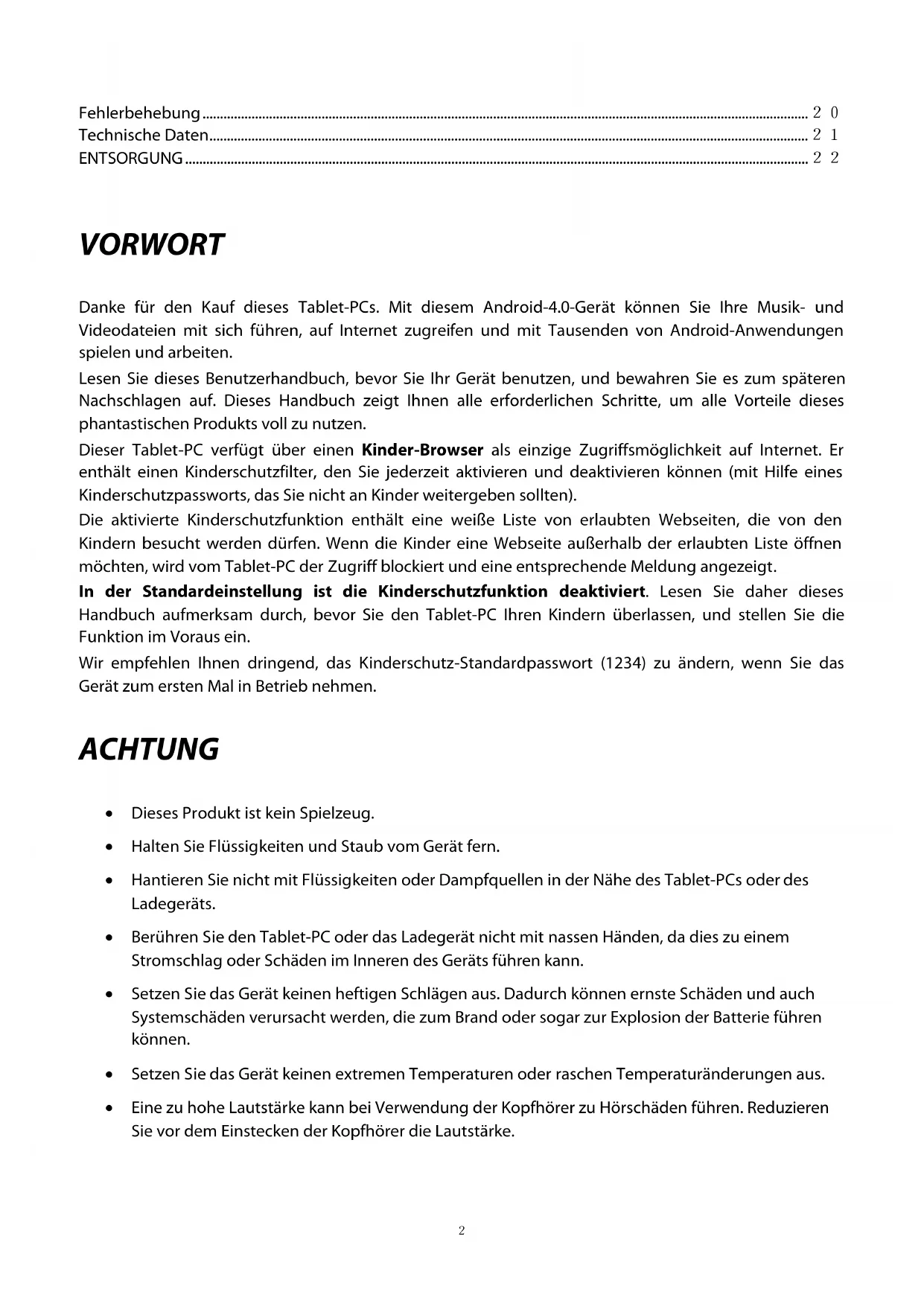 Fehlerbehebung ............................................................................................................................................................................. 20 Technische Daten ........................................................................................................................................................................... 21 ENTSORGUNG .................................................................................................................................................................................. 22 VORWORT Danke für den Kauf dieses Tablet-PCs. Mit diesem Android-4.0-Gerät können Sie Ihre Musik- und Videodateien mit sich führen, auf Internet zugreifen und mit Tausenden von Android-Anwendungen spielen und arbeiten. Lesen Sie dieses Benutzerhandbuch, bevor Sie Ihr Gerät benutzen, und bewahren Sie es zum späteren Nachschlagen auf. Dieses Handbuch zeigt Ihnen alle erforderlichen Schritte, um alle Vorteile dieses phantastischen Produkts voll zu nutzen. Dieser Tablet-PC verfügt über einen Kinder-Browser als einzige Zugriffsmöglichkeit auf Internet. Er enthält einen Kinderschutzfilter, den Sie jederzeit aktivieren und deaktivieren können (mit Hilfe eines Kinderschutzpassworts, das Sie nicht an Kinder weitergeben sollten). Die aktivierte Kinderschutzfunktion enthält eine weiße Liste von erlaubten Webseiten, die von den Kindern besucht werden dürfen. Wenn die Kinder eine Webseite außerhalb der erlaubten Liste öffnen möchten, wird vom Tablet-PC der Zugriff blockiert und eine entsprechende Meldung angezeigt. In der Standardeinstellung ist die Kinderschutzfunktion deaktiviert. Lesen Sie daher dieses Handbuch aufmerksam durch, bevor Sie den Tablet-PC Ihren Kindern überlassen, und stellen Sie die Funktion im Voraus ein. Wir empfehlen Ihnen dringend, das Kinderschutz-Standardpasswort (1234) zu ändern, wenn Sie das Gerät zum ersten Mal in Betrieb nehmen. ACHTUNG