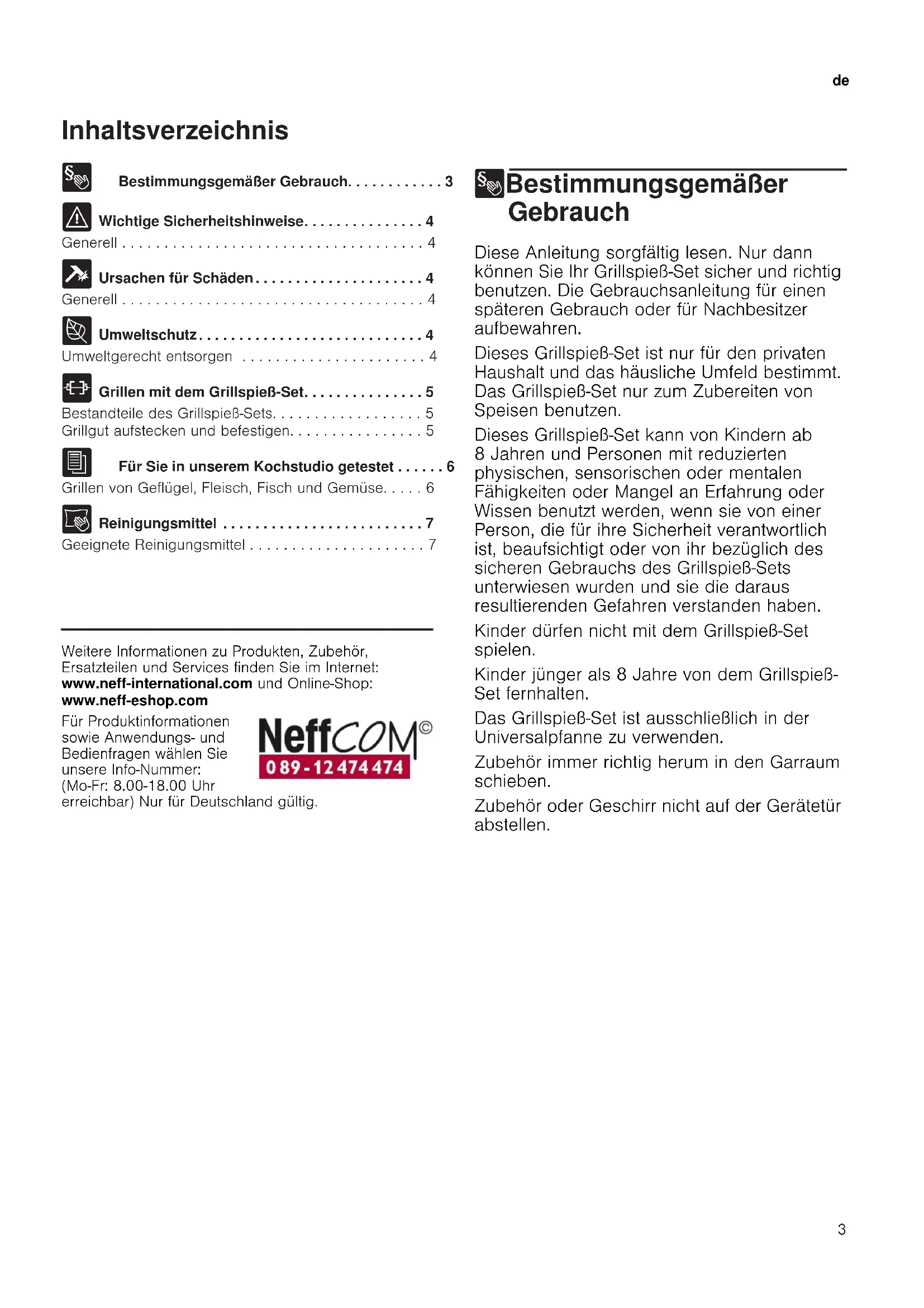- Geeignete Reinigungsmittel Produktinfo Weitere Informationen zu Produkten, Zubehör, Ersatzteilen und Services finden Sie im Internet: www.neff-international.com und Online-Shop: www.neff-eshop.com Für Produktinformationen sowie Anwendungs- und Bedienfragen wählen Sie unsere Info-Nummer: (Mo-Fr: 8.00-18.00 Uhr erreichbar) Nur für Deutschland gültig. 8Bestimmungsgemäßer Gebrauch Bestimmungsgemäßer Gebrauch Diese Anleitung sorgfältig lesen. Nur dann können Sie Ihr Grillspieß-Set sicher und richtig benutzen. Die Gebrauchsanleitung für einen späteren Gebrauch oder für Nachbesitzer aufbewahren. Dieses Grillspieß-Set ist nur für den privaten Haushalt und das häusliche Umfeld bestimmt. Das Grillspieß-Set nur zum Zubereiten von Speisen benutzen. Dieses Grillspieß-Set kann von Kindern ab 8 Jahren und Personen mit reduzierten physischen, sensorischen oder mentalen Fähigkeiten oder Mangel an Erfahrung oder Wissen benutzt werden, wenn sie von einer Person, die für ihre Sicherheit verantwortlich ist, beaufsichtigt oder von ihr bezüglich des sicheren Gebrauchs des Grillspieß-Sets unterwiesen wurden und sie die daraus resultierenden Gefahren verstanden haben. Kinder dürfen nicht mit dem Grillspieß-Set spielen. Kinder jünger als 8 Jahre von dem Grillspieß- Set fernhalten. Das Grillspieß-Set ist ausschließlich in der Universalpfanne zu verwenden. Zubehör immer richtig herum in den Garraum schieben. Zubehör oder Geschirr nicht auf der Gerätetür abstellen.de Wichtige Sicherheitshinweise p. 7