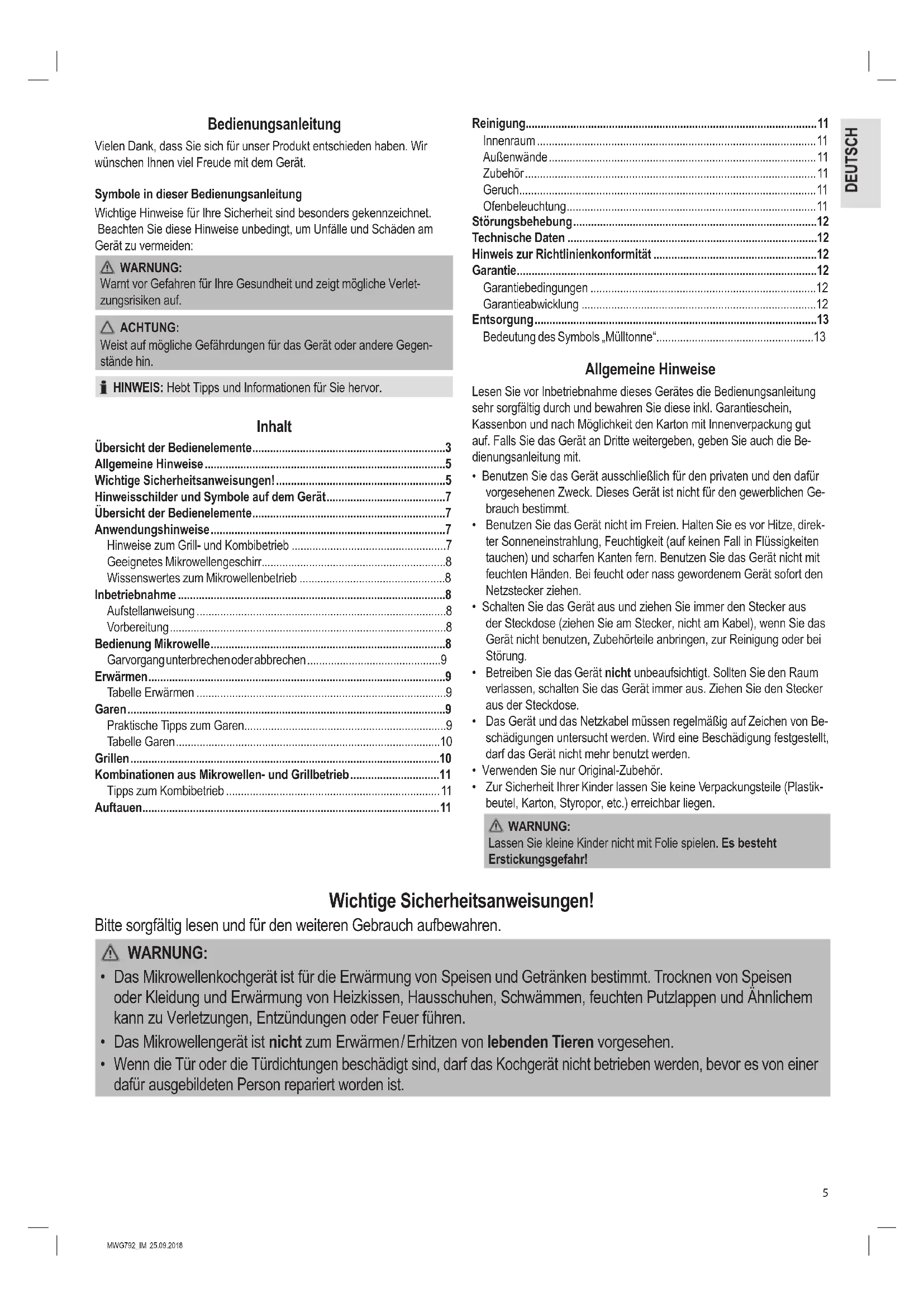- Wenn die Tür oder die Türdichtungen beschädigt sind, darf das Kochgerät nicht betrieben werden, bevor es von einer dafür ausgebildeten Person repariert worden ist.6 MWG792_IM 25.09.2018 WARNUNG: