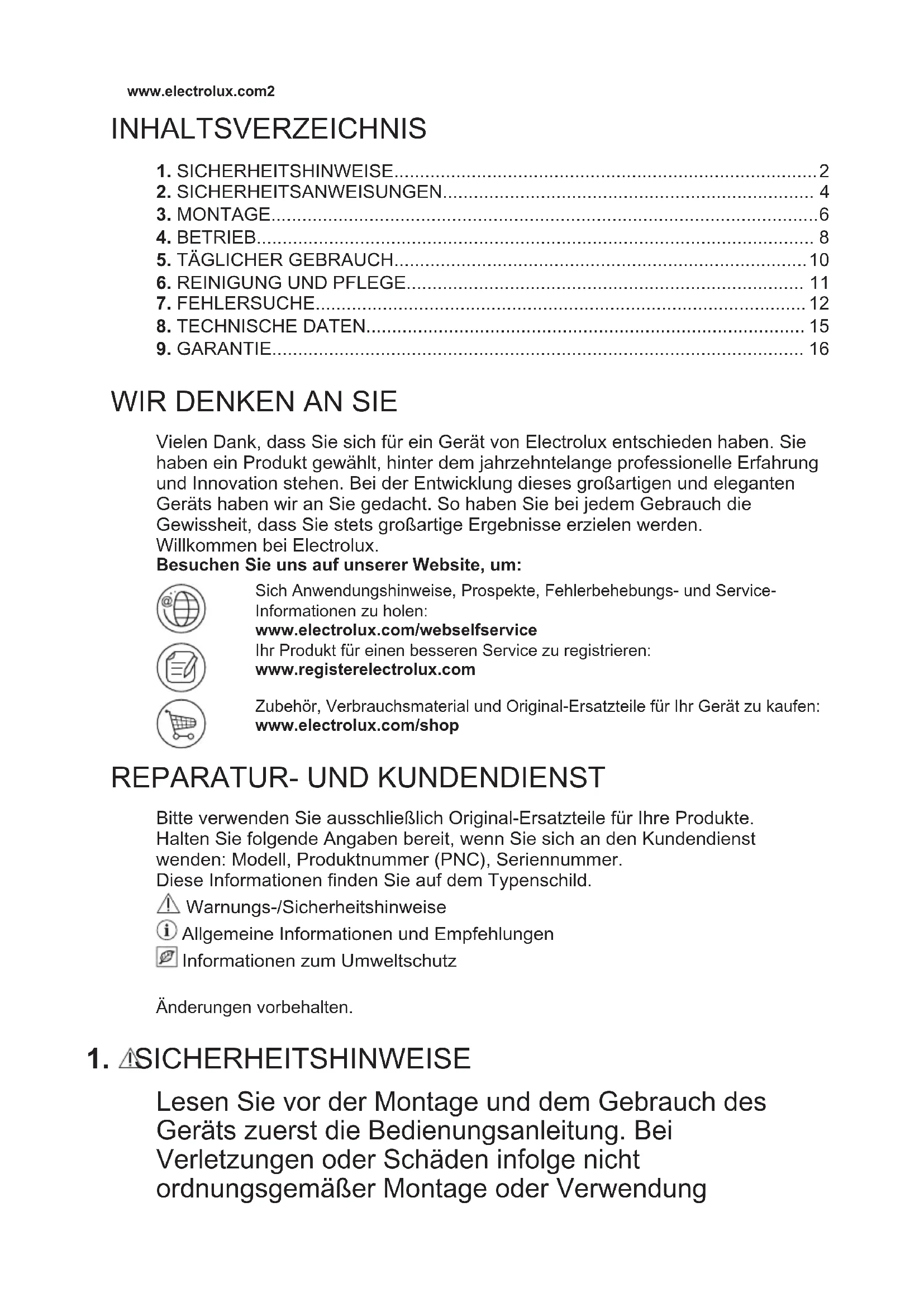 Lesen Sie vor der Montage und dem Gebrauch des Geräts zuerst die Bedienungsanleitung. Bei Verletzungen oder Schäden infolge nicht ordnungsgemäßer Montage oder Verwendung www.electrolux.com2übernimmt der Hersteller keine Haftung. Bewahren Sie die Anleitung zum Nachschlagen an einem sicheren und zugänglichen Ort auf.
