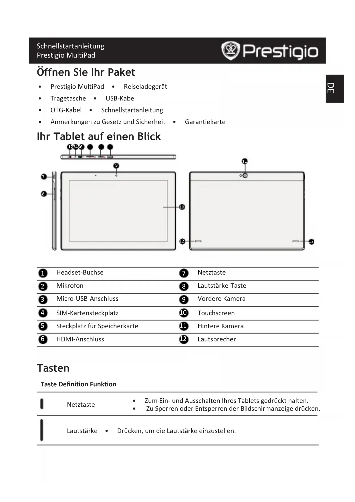- ZuSperrenoderEntsperrenderBildschirmanzeigedrücken. Lautstärke • Drücken,umdieLautstärkeeinzustellen.DE Schnellstartanleitung Prestigio MultiPad Back