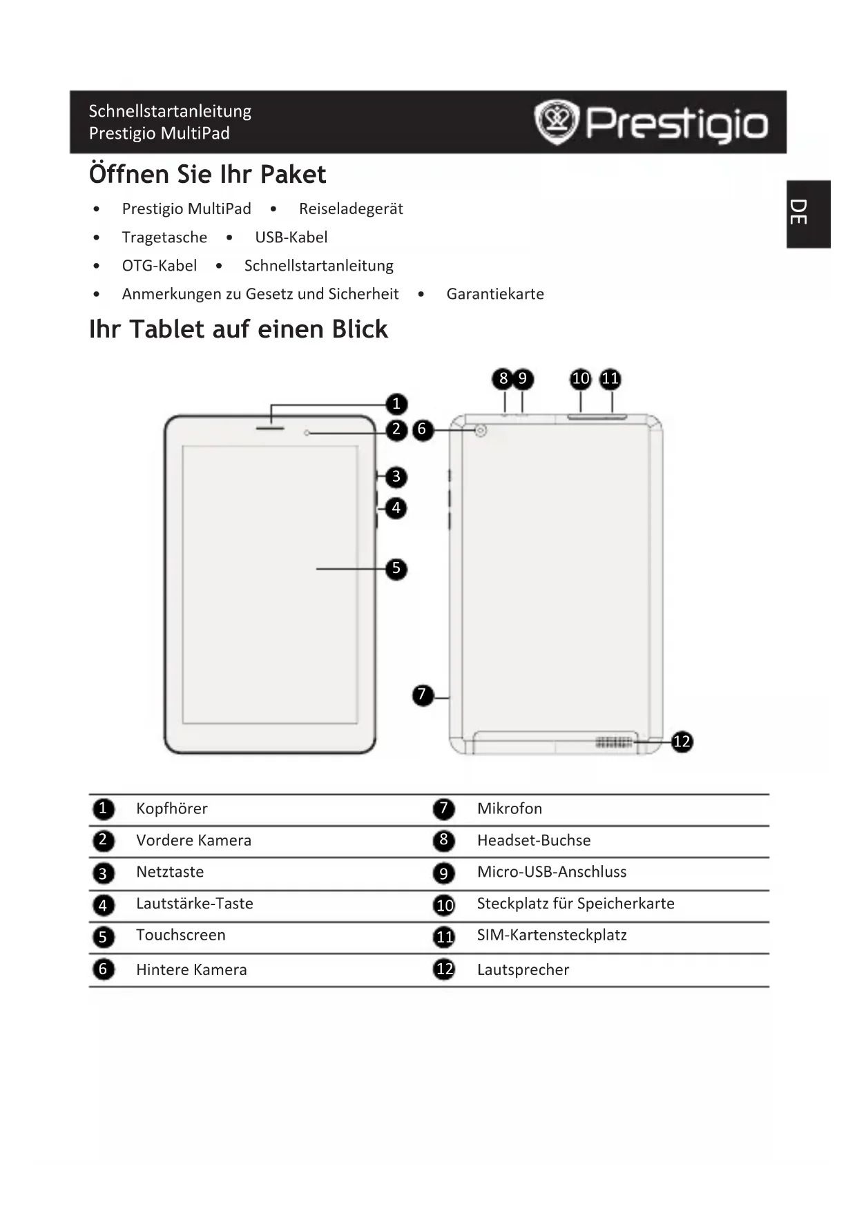 NanoSIM MicroSIM StandardSIM 3.HaltenSiedieNetztastegedrückt,umdasTabletanzuschalten. Aufladen des Tablets VerbindenSieIhrTabletüberdasbeigelegteUSB-KabelunddasReiseladegerätmiteiner Steckdose.DE Schnellstartanleitung Prestigio MultiPad Einen Anruf durchführen WendenSieeinederfolgendenMethodenan.