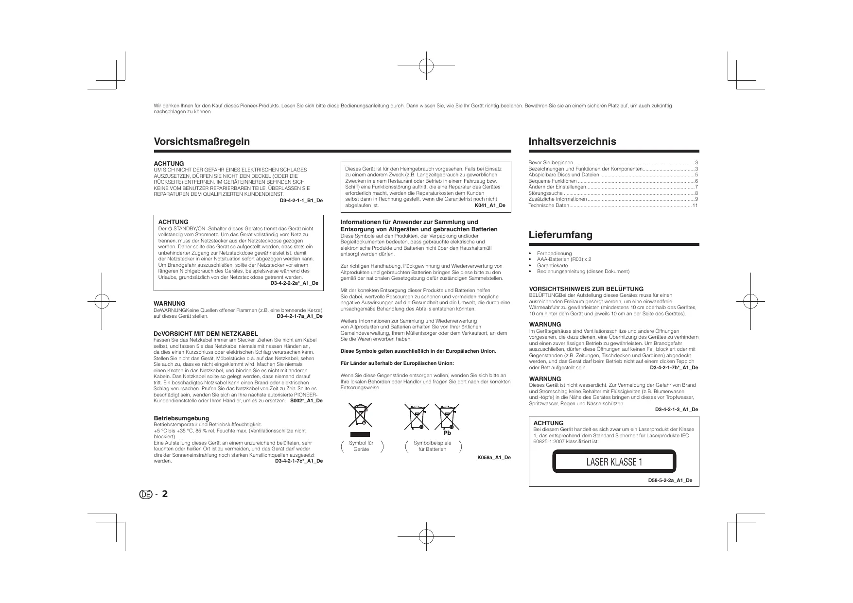Wir danken lhnen für den Kauf dieses Pioneer-Produkts. Lesen Sie sich bitte diese Bedienungsanleitung durch. Dann wissen Sie, wie Sie lhr Gerät richtig bedienen. Bewahren Sie sie an einem sicheren Platz auf, um auch zukünftig nachschlagen zu können.