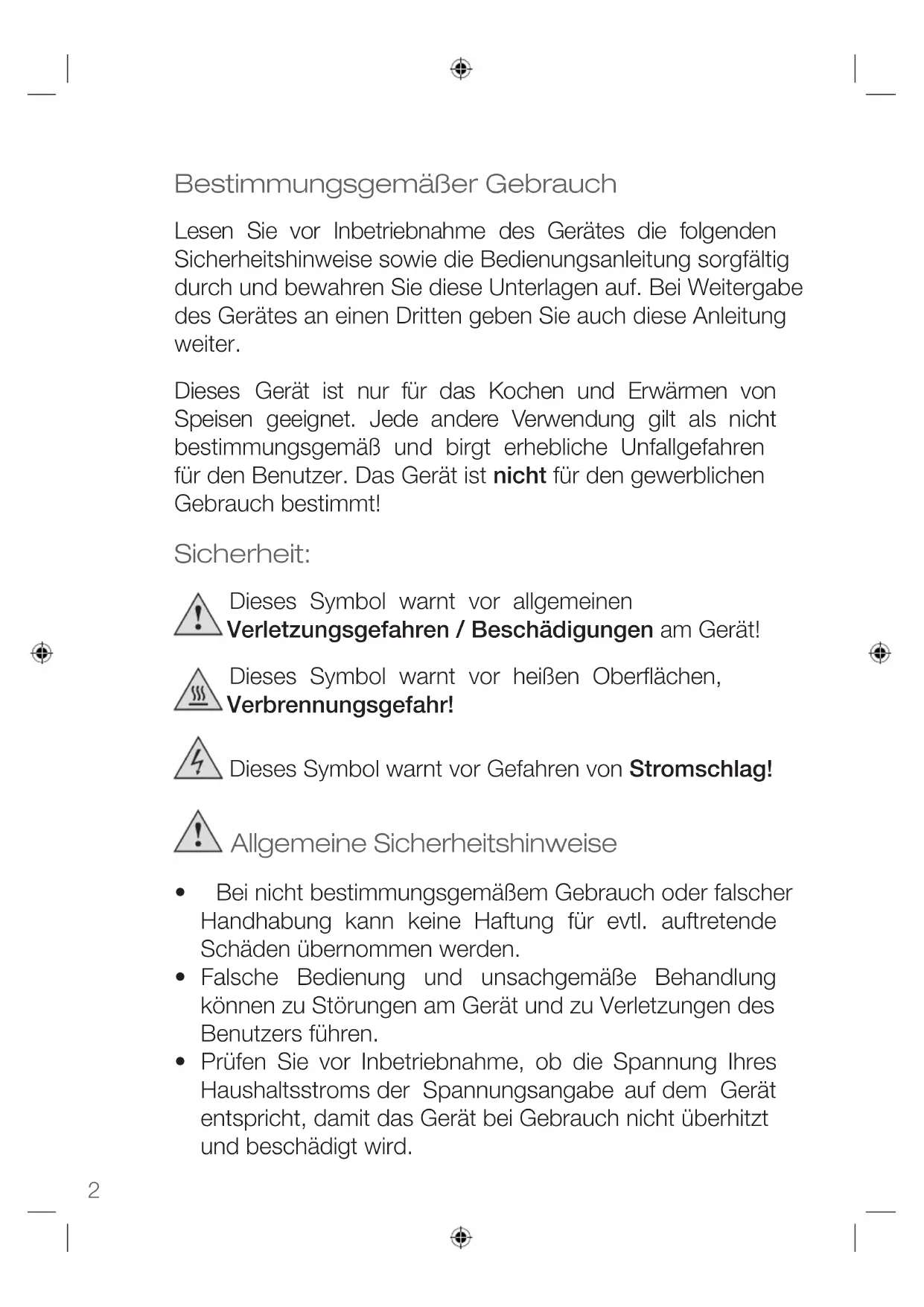 Bestimmungsgemäßer Gebrauch Lesen Sie vor Inbetriebnahme des Gerätes die folgenden Sicherheitshinweise sowie die Bedienungsanleitung sorgfältig durch und bewahren Sie diese Unterlagen auf. Bei Weitergabe des Gerätes an einen Dritten geben Sie auch diese Anleitung weiter. Dieses Gerät ist nur für das Kochen und Erwärmen von Speisen geeignet. Jede andere Verwendung gilt als nicht bestimmungsgemäß und birgt erhebliche Unfallgefahren für den Benutzer. Das Gerät ist nicht für den gewerblichen Gebrauch bestimmt! Sicherheit: Dieses Symbol warnt vor allgemeinen Verletzungsgefahren / Beschädigungen am Gerät! Dieses Symbol warnt vor heißen Oberflächen, Verbrennungsgefahr! Dieses Symbol warnt vor Gefahren von Stromschlag! Allgemeine Sicherheitshinweise