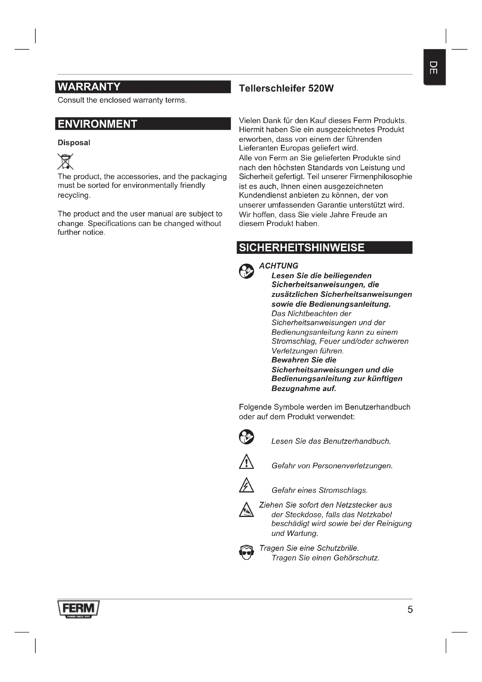 WARRANTY Consulttheenclosedwarrantyterms. ENVIRONMENT Disposal The product, the accessories, and the packaging must be sorted for environmentally friendly recycling. The product and the user manual are subject to change.Specicationscanbechangedwithout further notice. Tellerschleifer 520W VielenDankfürdenKaufdiesesFermProdukts. HiermithabenSieeinausgezeichnetesProdukt erworben,dassvoneinemderführenden Lieferanten Europas geliefert wird. Alle von Ferm an Sie gelieferten Produkte sind nach den höchsten Standards von Leistung und Sicherheit gefertigt. Teil unserer Firmenphilosophie istesauch,Ihneneinenausgezeichneten Kundendienstanbietenzukönnen,dervon unsererumfassendenGarantieunterstütztwird. Wir hoffen, dass Sie viele Jahre Freude an diesem Produkt haben. SICHERHEITSHINWEISE