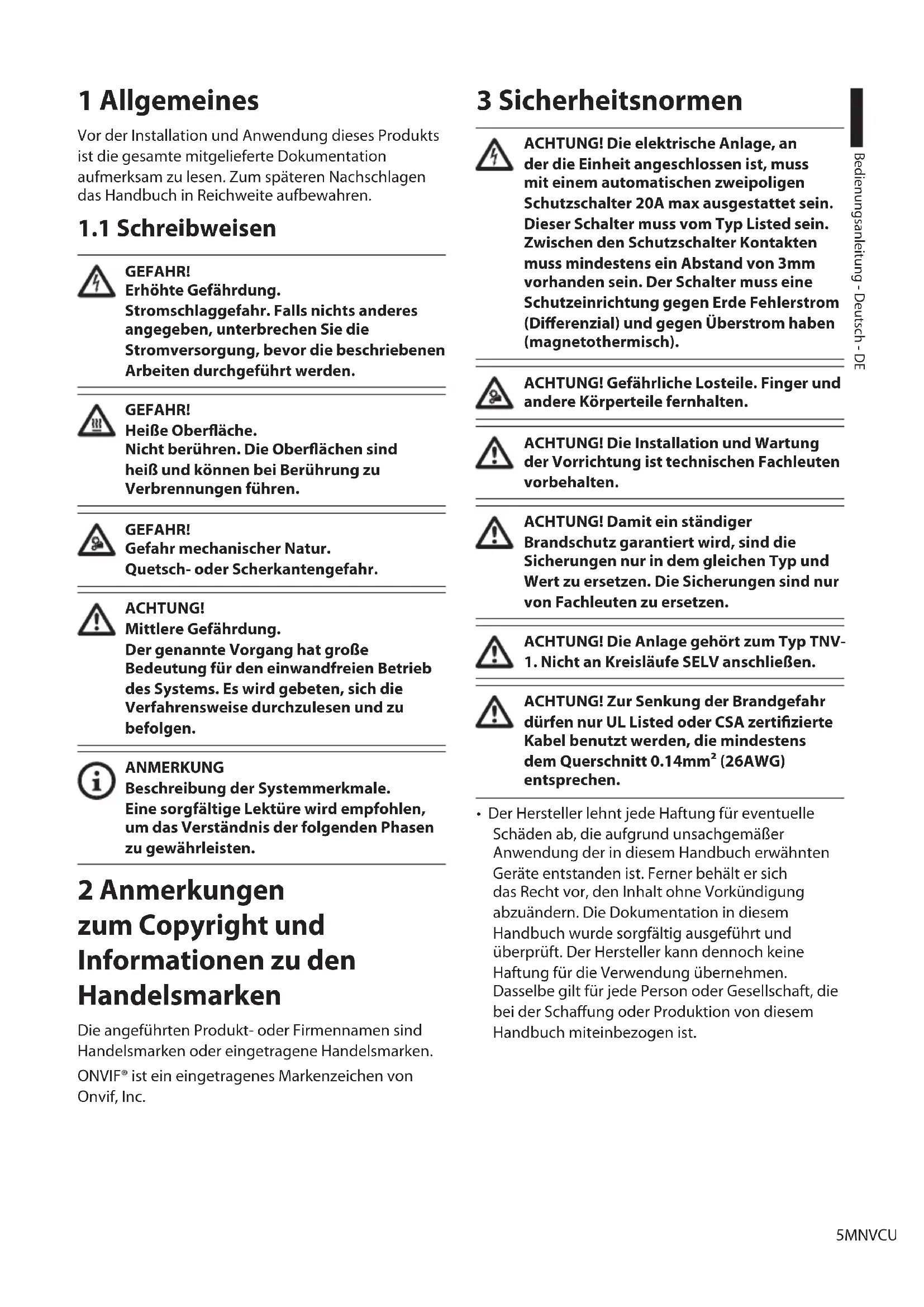 Vor Beginn der Installationsarbeiten ist zu kontrollieren, ob das gelieferte Material den jeweiligen Anforderungen entspricht. Zu erkennen ist dies anhand der Kennzeichnungsschilder. Unter keinen Umständen dürfen Veränderungen oder Anschlüsse vorgenommen werden, die in diesem Handbuch nicht genannt sind. Der Gebrauch ungeeigneten Geräts kann die Sicherheit des Personals und der Anlage schwer gefährden.Bedienungsanleitung - Deutsch - DE 9MNVCUPKHXL_2222_DE 5 Versionen