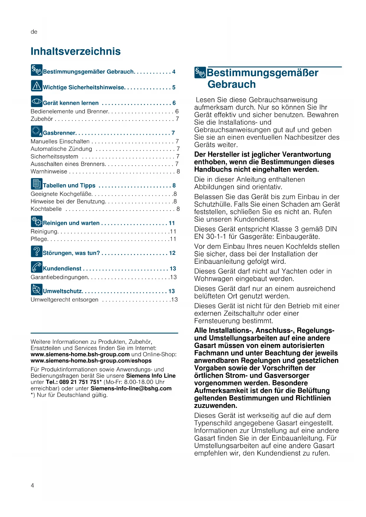 - Gerät kennen lernen . . . . . . . . . . . . . . . . . . . . . . 6 Bedienelemente und Brenner. . . . . . . . . . . . . . . . . . . . 6 Zubehör . . . . . . . . . . . . . . . . . . . . . . . . . . . . . . . . . . . . 7 Ä Gasbrenner. . . . . . . . . . . . . . . . . . . . . . . . . . . . . . 7 Manuelles Einschalten . . . . . . . . . . . . . . . . . . . . . . . . . 7 Automatische Zündung . . . . . . . . . . . . . . . . . . . . . . . . 7 Sicherheitssystem . . . . . . . . . . . . . . . . . . . . . . . . . . . . 7 Ausschalten eines Brenners. . . . . . . . . . . . . . . . . . . . . 7 Warnhinweise . . . . . . . . . . . . . . . . . . . . . . . . . . . . . . . . 8 J Tabellen und Tipps . . . . . . . . . . . . . . . . . . . . . . . 8 Geeignete Kochgefäße. . . . . . . . . . . . . . . . . . . . . . . . .8 Hinweise bei der Benutzung. . . . . . . . . . . . . . . . . . . . .8 Kochtabelle . . . . . . . . . . . . . . . . . . . . . . . . . . . . . . . . . 8 2 Reinigen und warten . . . . . . . . . . . . . . . . . . . . . 11 Reinigung. . . . . . . . . . . . . . . . . . . . . . . . . . . . . . . . . .11 Pflege. . . . . . . . . . . . . . . . . . . . . . . . . . . . . . . . . . . . .11 3 Störungen, was tun? . . . . . . . . . . . . . . . . . . . . . 12 4 Kundendienst . . . . . . . . . . . . . . . . . . . . . . . . . . . 13 Garantiebedingungen. . . . . . . . . . . . . . . . . . . . . . . . .13 7 Umweltschutz. . . . . . . . . . . . . . . . . . . . . . . . . . . 13 Umweltgerecht entsorgen . . . . . . . . . . . . . . . . . . . . .13 Produktinfo Weitere Informationen zu Produkten, Zubehör, Ersatzteilen und Services finden Sie im Internet: www.siemens-home.bsh-group.com und Online-Shop: www.siemens-home.bsh-group.com/eshops Für Produktinformationen sowie Anwendungs- und Bedienungsfragen berät Sie unsere Siemens Info Line unter Tel.: 089 21 751 751* (Mo-Fr: 8.00-18.00 Uhr erreichbar) oder unter Siemens-info-line@bshg.com *) Nur für Deutschland gültig. 8Bestimmungsgemäßer Gebrauch Be s t i mmungs gemäßer Gebr auch Lesen Sie diese Gebrauchsanweisung aufmerksam durch. Nur so können Sie Ihr Gerät effektiv und sicher benutzen. Bewahren Sie die Installations- und Gebrauchsanweisungen gut auf und geben Sie sie an einen eventuellen Nachbesitzer des Geräts weiter. Der Hersteller ist jeglicher Verantwortung enthoben, wenn die Bestimmungen dieses Handbuchs nicht eingehalten werden. Die in dieser Anleitung enthaltenen Abbildungen sind orientativ. Belassen Sie das Gerät bis zum Einbau in der Schutzhülle. Falls Sie einen Schaden am Gerät feststellen, schließen Sie es nicht an. Rufen Sie unseren Kundendienst. Dieses Gerät entspricht Klasse 3 gemäß DIN EN 30-1-1 für Gasgeräte: Einbaugeräte. Vor dem Einbau Ihres neuen Kochfelds stellen Sie sicher, dass bei der Installation der Einbauanleitung gefolgt wird. Dieses Gerät darf nicht auf Yachten oder in Wohnwagen eingebaut werden. Dieses Gerät darf nur an einem ausreichend belüfteten Ort genutzt werden. Dieses Gerät ist nicht für den Betrieb mit einer externen Zeitschaltuhr oder einer Fernsteuerung bestimmt. Alle Installations-, Anschluss-, Regelungs- und Umstellungsarbeiten auf eine andere Gasart müssen von einem autorisierten Fachmann und unter Beachtung der jeweils anwendbaren Regelungen und gesetzlichen Vorgaben sowie der Vorschriften der örtlichen Strom- und Gasversorger vorgenommen werden. Besondere Aufmerksamkeit ist den für die Belüftung geltenden Bestimmungen und Richtlinien zuzuwenden. Dieses Gerät ist werkseitig auf die auf dem Typenschild angegebene Gasart eingestellt. Informationen zur Umstellung auf eine andere Gasart finden Sie in der Einbauanleitung. Für Umstellungsarbeiten auf eine andere Gasart empfehlen wir, den Kundendienst zu rufen.Wichtige Sicherheitshinweise de