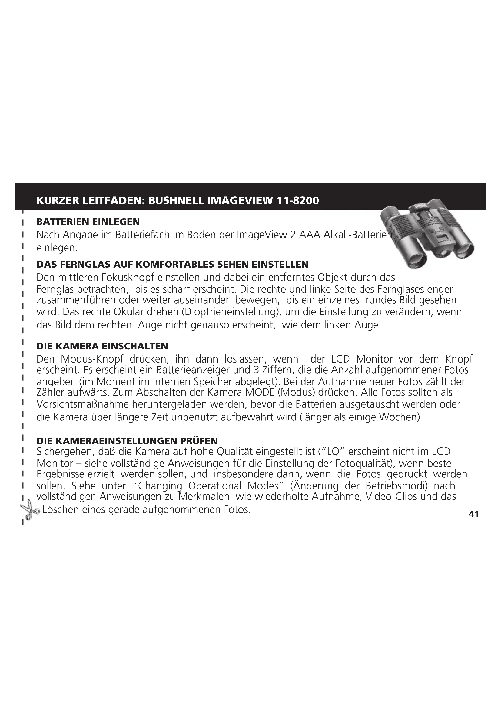 Sichergehen, daß die Kamera auf hohe Qualität eingestellt ist (“LQ” erscheint nicht im LCD Monitor – siehe vollständige Anweisungen für die Einstellung der Fotoqualität), wenn beste Ergebnisse erzielt werden sollen, und insbesondere dann, wenn die Fotos gedruckt werden sollen. Siehe unter “Changing Operational Modes” (Änderung der Betriebsmodi) nach vollständigen Anweisungen zu Merkmalen wie wiederholte Aufnahme, Video-Clips und das Löschen eines gerade aufgenommenen Fotos. 41KURZER LEITFADEN EIN FOTO AUFNEHMEN (TIPS FÜR BESSERE FOTOQUALITÄT) Die ImageView so ruhig wie möglich halten, dabei liegen die Hände um das Fernglas, den SNAP Knopf mit dem flachen Ende eines Fingers leicht herunterdrücken. Man kann sich dabei an eine Wand oder an einen Baum usw. lehnen und sich somit abstützen, was dazu beiträgt, daß die Kamera sich bei der Aufnahme eines Fotos nicht bewegt. Sichergehen, mindestens 9 Meter Abstand zum Fotoobjekt einzuhalten. Anders als bei den Fernglasoptiken, (die bis zu ca. 4,50 m fokussieren), ist der Kamerafokus voreingestellt und nur entfernte Objekte ausgelegt – Die Fotos können bei zu geringem Abstand unscharf sein.