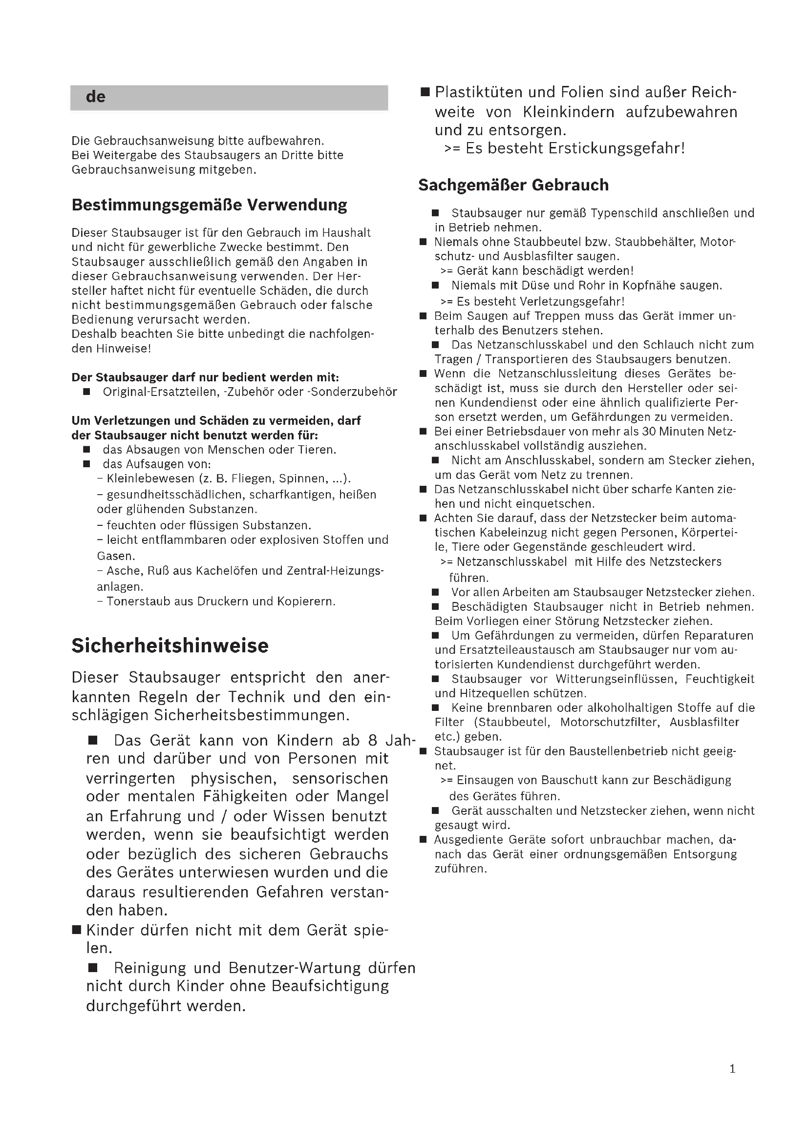 ﻡﺍﺩﺧﺗﺳﻻﺍ ﺕﺍﺩﺎﺷﺭﺇ BGS1xxx_9000953793_Cover.indd 1 11.04.2014 12:05:001 Die Gebrauchsanweisung bitte aufbewahren. Bei Weitergabe des Staubsaugers an Dritte bitte Gebrauchsanweisung mitgeben. Bestimmungsgemäße Verwendung Dieser Staubsauger ist für den Gebrauch im Haushalt und nicht für gewerbliche Zwecke bestimmt. Den Staubsauger ausschließlich gemäß den Angaben in dieser Gebrauchsanweisung verwenden. Der Her- steller haftet nicht für eventuelle Schäden, die durch nicht bestimmungsgemäßen Gebrauch oder falsche Bedienung verursacht werden. Deshalb beachten Sie bitte unbedingt die nachfolgen- den Hinweise! Der Staubsauger darf nur bedient werden mit: Original-Ersatzteilen, -Zubehör oder -Sonderzubehör Um Verletzungen und Schäden zu vermeiden, darf der Staubsauger nicht benutzt werden für: das Absaugen von Menschen oder Tieren. das Aufsaugen von: − Kleinlebewesen (z. B. Fliegen, Spinnen, ...). − gesundheitsschädlichen, scharfkantigen, heißen oder glühenden Substanzen. − feuchten oder flüssigen Substanzen. − leicht entflammbaren oder explosiven Stoffen und Gasen. − Asche, Ruß aus Kachelöfen und Zentral-Heizungs- anlagen. − Tonerstaub aus Druckern und Kopierern. Sicherheitshinweise Dieser Staubsauger entspricht den aner- kannten Regeln der Technik und den ein- schlägigen Sicherheitsbestimmungen. Das Gerät kann von Kindern ab 8 Jah- ren und darüber und von Personen mit verringerten physischen, sensorischen oder mentalen Fähigkeiten oder Mangel an Erfahrung und / oder Wissen benutzt werden, wenn sie beaufsichtigt werden oder bezüglich des sicheren Gebrauchs des Gerätes unterwiesen wurden und die daraus resultierenden Gefahren verstan- den haben. Kinder dürfen nicht mit dem Gerät spie- len. Reinigung und Benutzer-Wartung dürfen nicht durch Kinder ohne Beaufsichtigung durchgeführt werden. Plastiktüten und Folien sind außer Reich- weite von Kleinkindern aufzubewahren und zu entsorgen. >= Es besteht Erstickungsgefahr! Sachgemäßer Gebrauch Staubsauger nur gemäß Typenschild anschließen und in Betrieb nehmen. Niemals ohne Staubbeutel bzw. Staubbehälter, Motor- schutz- und Ausblasfilter saugen. >= Gerät kann beschädigt werden! Niemals mit Düse und Rohr in Kopfnähe saugen. >= Es besteht Verletzungsgefahr! Beim Saugen auf Treppen muss das Gerät immer un- terhalb des Benutzers stehen. Das Netzanschlusskabel und den Schlauch nicht zum Tragen / Transportieren des Staubsaugers benutzen. Wenn die Netzanschlussleitung dieses Gerätes be- schädigt ist, muss sie durch den Hersteller oder sei- nen Kundendienst oder eine ähnlich qualifizierte Per- son ersetzt werden, um Gefährdungen zu vermeiden. Bei einer Betriebsdauer von mehr als 30 Minuten Netz- anschlusskabel vollständig ausziehen. Nicht am Anschlusskabel, sondern am Stecker ziehen, um das Gerät vom Netz zu trennen. Das Netzanschlusskabel nicht über scharfe Kanten zie- hen und nicht einquetschen. Achten Sie darauf, dass der Netzstecker beim automa- tischen Kabeleinzug nicht gegen Personen, Körpertei- le, Tiere oder Gegenstände geschleudert wird. >= Netzanschlusskabel mit Hilfe des Netzsteckers führen. Vor allen Arbeiten am Staubsauger Netzstecker ziehen. Beschädigten Staubsauger nicht in Betrieb nehmen. Beim Vorliegen einer Störung Netzstecker ziehen. Um Gefährdungen zu vermeiden, dürfen Reparaturen und Ersatzteileaustausch am Staubsauger nur vom au- torisierten Kundendienst durchgeführt werden. Staubsauger vor Witterungseinflüssen, Feuchtigkeit und Hitzequellen schützen. Keine brennbaren oder alkoholhaltigen Stoffe auf die Filter (Staubbeutel, Motorschutzfilter, Ausblasfilter etc.) geben. Staubsauger ist für den Baustellenbetrieb nicht geeig- net. >= Einsaugen von Bauschutt kann zur Beschädigung des Gerätes führen. Gerät ausschalten und Netzstecker ziehen, wenn nicht gesaugt wird. Ausgediente Geräte sofort unbrauchbar machen, da- nach das Gerät einer ordnungsgemäßen Entsorgung zuführen. de2