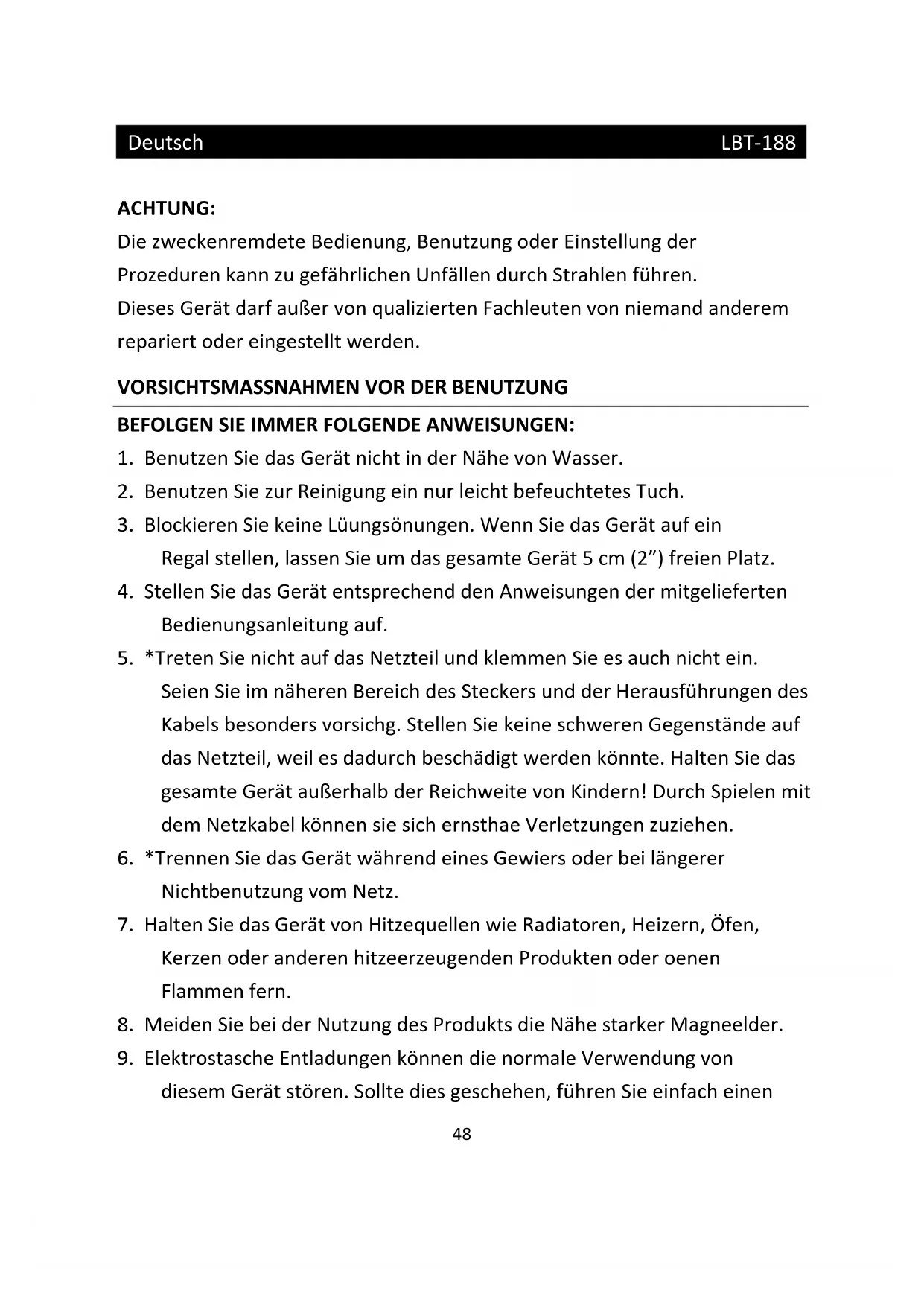 ACHTUNG: Die zweckentfremdete Bedienung, Benutzung oder Einstellung der Prozeduren kann zu gefährlichen Unfällen durch Strahlen führen. Dieses Gerät darf außer von qualifizierten Fachleuten von niemand anderem repariert oder eingestellt werden.