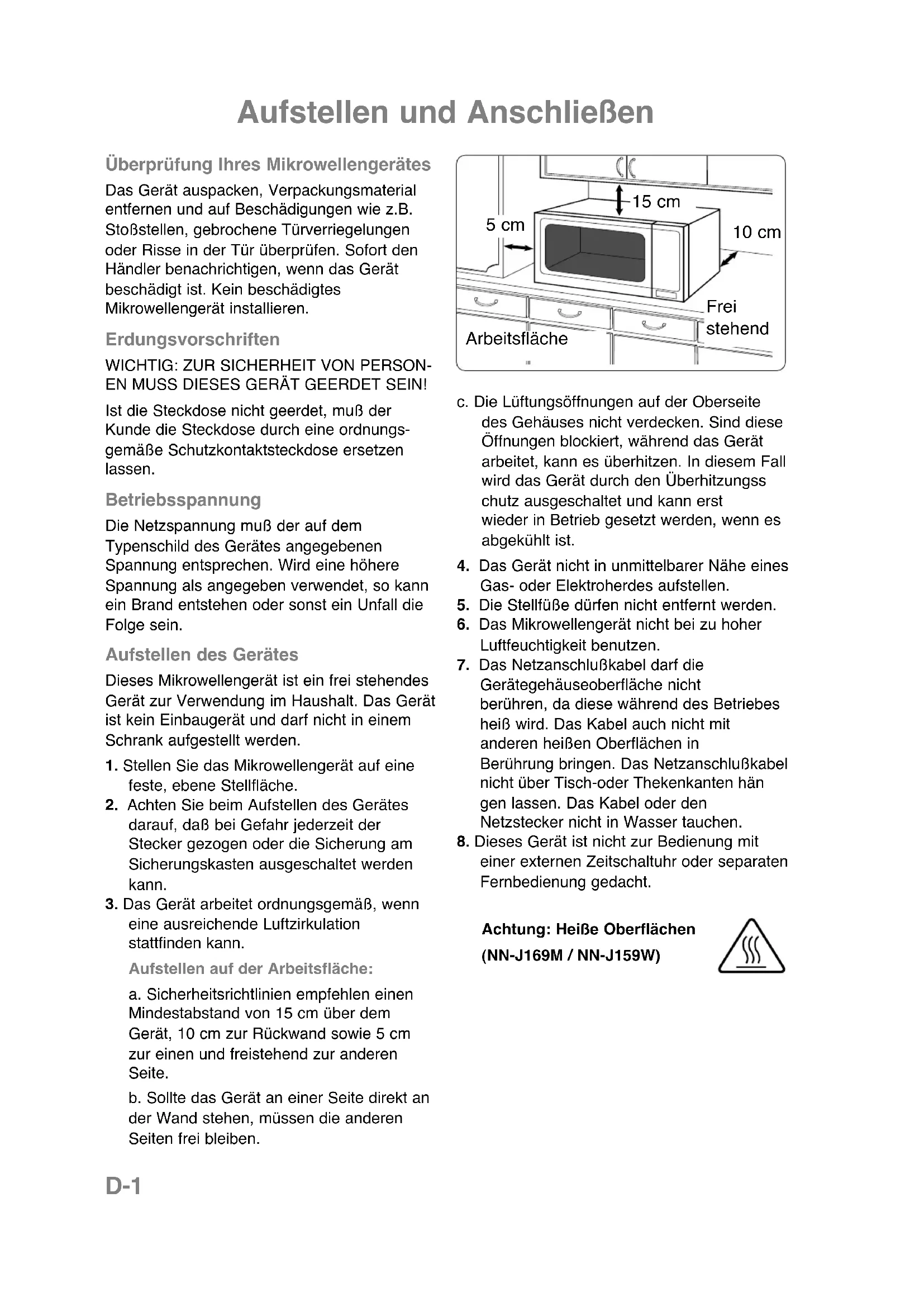 einer externen Zeitschaltuhr oder separaten Fernbedienung gedacht. Arbeitsfläche 5 cm 10 cm Frei stehend 15 cm Achtung: Heiße Oberflächen (NN-J169M / NN-J159W)D-2