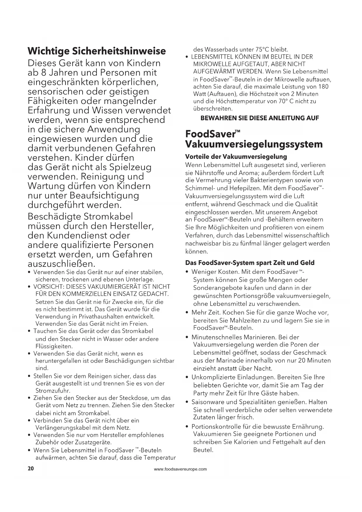 -Gerät ordnungsgemäß funktioniert, empfehlen wir, die Dichtungen jährlich auszutauschen. Ersatzteile können Sie auf www.foodsavereurope.com bestellen. Lagerung Schließen Sie den Deckel, bis die Verriegelung greift und Sie ein Klicken vernehmen, drücken Sie den Deckel jedoch nicht vollständig zu, so dass die Verriegelung nicht einrastet und der grüne Streifen nicht sichtbar ist. Der Deckel ist so gesichert, die Dichtungen werden jedoch nicht zusammengedrückt (dies könnte zur Fehlfunktion des Geräts führen). Wickeln Sie das Stromkabel um die Klammern auf der Unterseite des Geräts. Das Gerät kann wie dargestellt vertikal gelagert werden. Tipps und Hinweise zur Lagerung Vakuumverpackung und Lebensmittelsicherheit Bei der Vakuumverpackung wird die Haltbarkeit von Lebensmitteln durch das Entfernen der Luft aus dem versiegelten Behälter verlängert, da die Oxidation, die sich auf Nährwert, Geschmack und Qualität allgemein auswirkt, verringert wird. Durch das Entfernen der Luft kann auch das Wachstum von Mikroorganismen, die unter bestimmten Umständen zu Problemen führen, eingeschränkt werden: Für die sichere Lagerung von Lebensmitteln sind niedrige Temperaturen wichtig. Bei Temperaturen von 4°C oder darunter wird das Wachstum von Mikroorganismen deutlich eingeschränkt. Tiefkühlen bei -17°C tötet Mikroorganismen nicht, stoppt aber ihr Wachstum. Für die langfristige Lagerung von verderblichen Lebensmitteln, die Sie vakuumverpackt haben, sollten Sie diese einfrieren und nach dem Auftauen im Kühlschrank aufbewahren. Denken Sie daran, dass die Vakuumverpackung KEIN Ersatz für die Konservierung in Dosen ist und Frische nur erhalten, aber nicht wiederherstellen kann. Durch die Vakuumverpackung wird die Qualitätsminderung lediglich verlangsamt. Es lässt sich nur schwer vorhersagen, wie lange Lebensmittel ihren guten Geschmack, ihr Aussehen und ihre Konsistenz behalten, da dies von Alter und Zustand der Lebensmittel am Tag der Vakuumverpackung abhängt. Wichtig: Vakuumverpackung ist KEIN Ersatz für die Aufbewahrung im Kühlschrank oder Tiefkühlfach. Verderbliche Lebensmittel, die gekühlt aufbewahrt werden müssen, müssen auch nach der Vakuumverpackung gekühlt oder tiefgekühlt gelagert werden. Um Erkrankungen vorzubeugen, verwenden Sie Beutel nicht erneut, nachdem Sie rohes Fleisch, rohen Fisch oder fettige Lebensmittel darin aufbewahrt haben. Verwenden Sie Beutel nicht erneut, nachdem sie in der Mikrowelle oder im Wasserbad erhitzt wurden.www.foodsavereurope.com