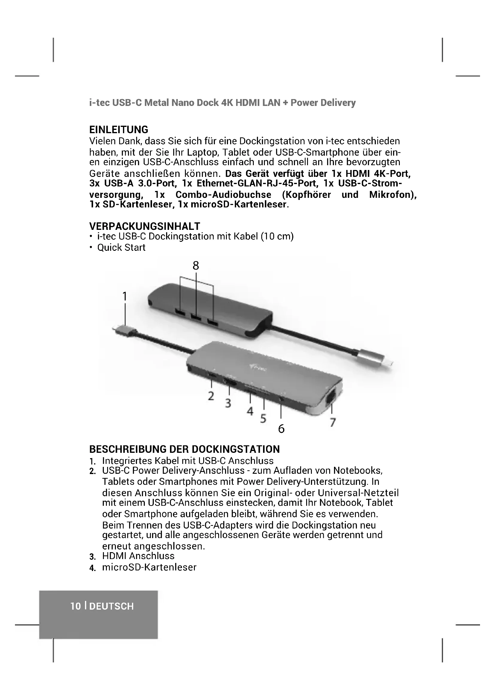 i-tec USB-C Metal Nano Dock 4K HDMI LAN + Power Delivery DEUTSCH EINLEITUNG Vielen Dank, dass Sie sich für eine Dockingstation von i-tec entschieden haben, mit der Sie Ihr Laptop, Tablet oder USB-C-Smartphone über ein- en einzigen USB-C-Anschluss einfach und schnell an Ihre bevorzugten Geräte anschließen können. Das Gerät verfügt über 1x HDMI 4K-Port, 3x USB-A 3.0-Port, 1x Ethernet-GLAN-RJ-45-Port, 1x USB-C-Strom- versorgung, 1x Combo-Audiobuchse (Kopfhörer und Mikrofon), 1x SD-Kartenleser, 1x microSD-Kartenleser. VERPACKUNGSINHALT