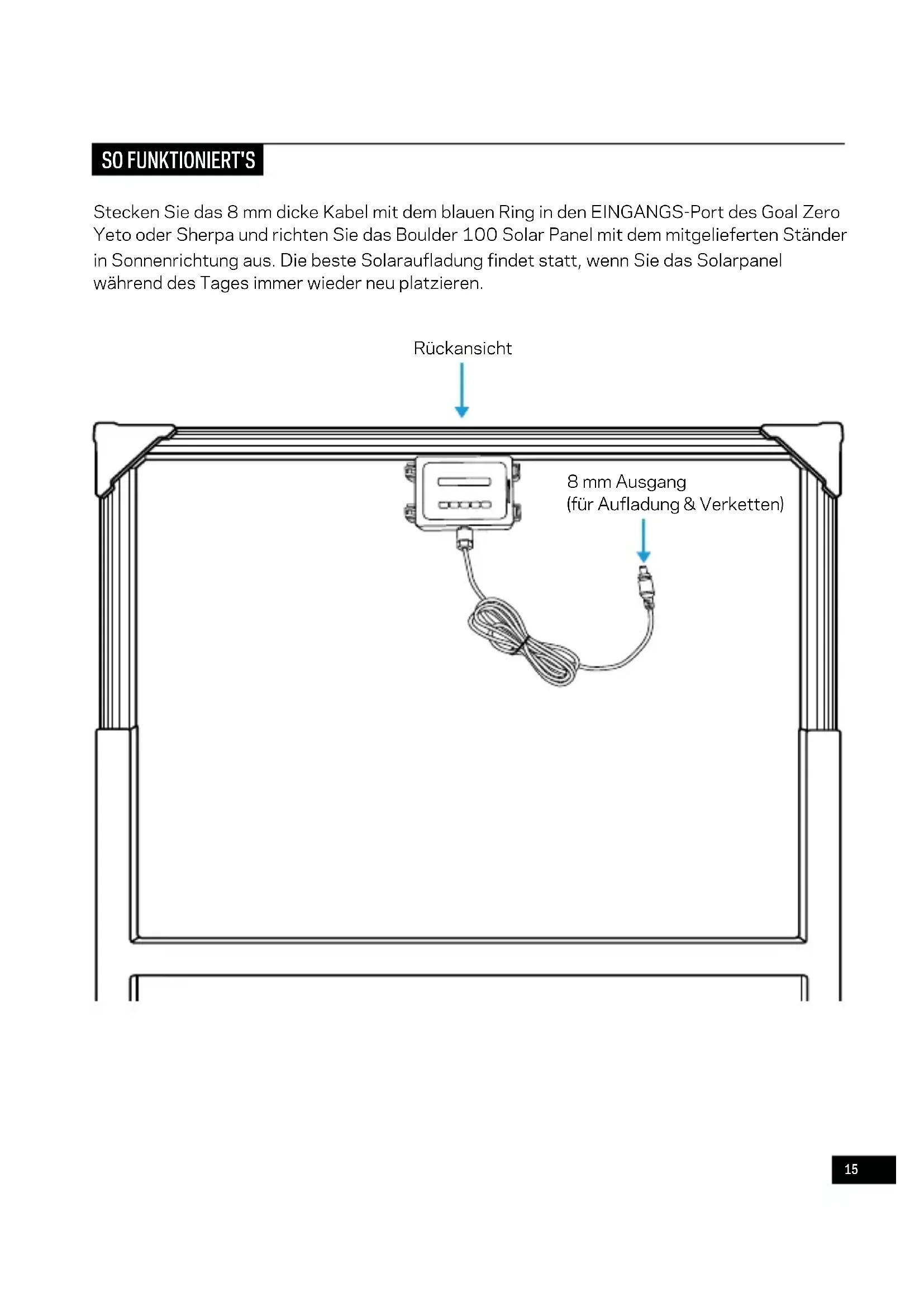 Ständer Vorderansicht15 SO FUNKTIONIERT'S Stecken Sie das 8 mm dicke Kabel mit dem blauen Ring in den EINGANGS-Port des Goal Zero Yeto oder Sherpa und richten Sie das Boulder 100 Solar Panel mit dem mitgelieferten Ständer in Sonnenrichtung aus. Die beste Solaraufladung findet statt, wenn Sie das Solarpanel während des Tages immer wieder neu platzieren. 8 mm Ausgang (für Aufladung & Verketten) Rückansicht16 Wenn Sie Boulder 100 Solar Panels verketten möchten und für Boulder-Konfigurationen mit mehr als 150 W verketten, ist der Kauf eines Kombinationskabels von Goal Zero notwendig. Kontaktieren Sie unser Customer Solutions Center, das Sie bei der Auswahl des richtigen Kabels für Ihr Gerät berät.