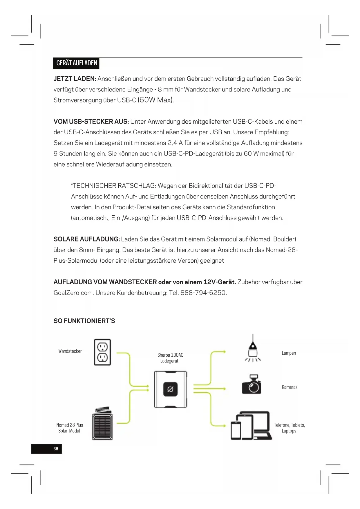 / USB-A Micro-USB / USB-A USB-C / USB-A USB-C / USB-C36 JETZT LADEN: Anschließen und vor dem ersten Gebrauch vollständig aufladen. Das Gerät verfügt über verschiedene Eingänge - 8 mm für Wandstecker und solare Aufladung und Stromversorgung über USB-C (60W Max). VOM USB-STECKER AUS: Unter Anwendung des mitgelieferten USB-C-Kabels und einem der USB-C-Anschlüssen des Geräts schließen Sie es per USB an. Unsere Empfehlung: Setzen Sie ein Ladegerät mit mindestens 2,4 A für eine vollständige Aufladung mindestens 9 Stunden lang ein. Sie können auch ein USB-C-PD-Ladegerät (bis zu 60 W maximal) für eine schnellere Wiederaufladung einsetzen. *TECHNISCHER RATSCHLAG: Wegen der Bidirektionalität der USB-C-PD- Anschlüsse können Auf- und Entladungen über denselben Anschluss durchgeführt werden. In den Produkt-Detailseiten des Geräts kann die Standardfunktion (automatisch,, Ein-/Ausgang) für jeden USB-C-PD-Anschluss gewählt werden. SOLARE AUFLADUNG: Laden Sie das Gerät mit einem Solarmodul auf (Nomad, Boulder) über den 8mm- Eingang. Das beste Gerät ist hierzu unserer Ansicht nach das Nomad-28- Plus-Solarmodul (oder eine leistungsstärkere Verson) geeignet AUFLADUNG VOM WANDSTECKER oder von einem 12V-Gerät. Zubehör verfügbar über GoalZero.com. Unsere Kundenbetreuung: Tel. 888-794-6250.