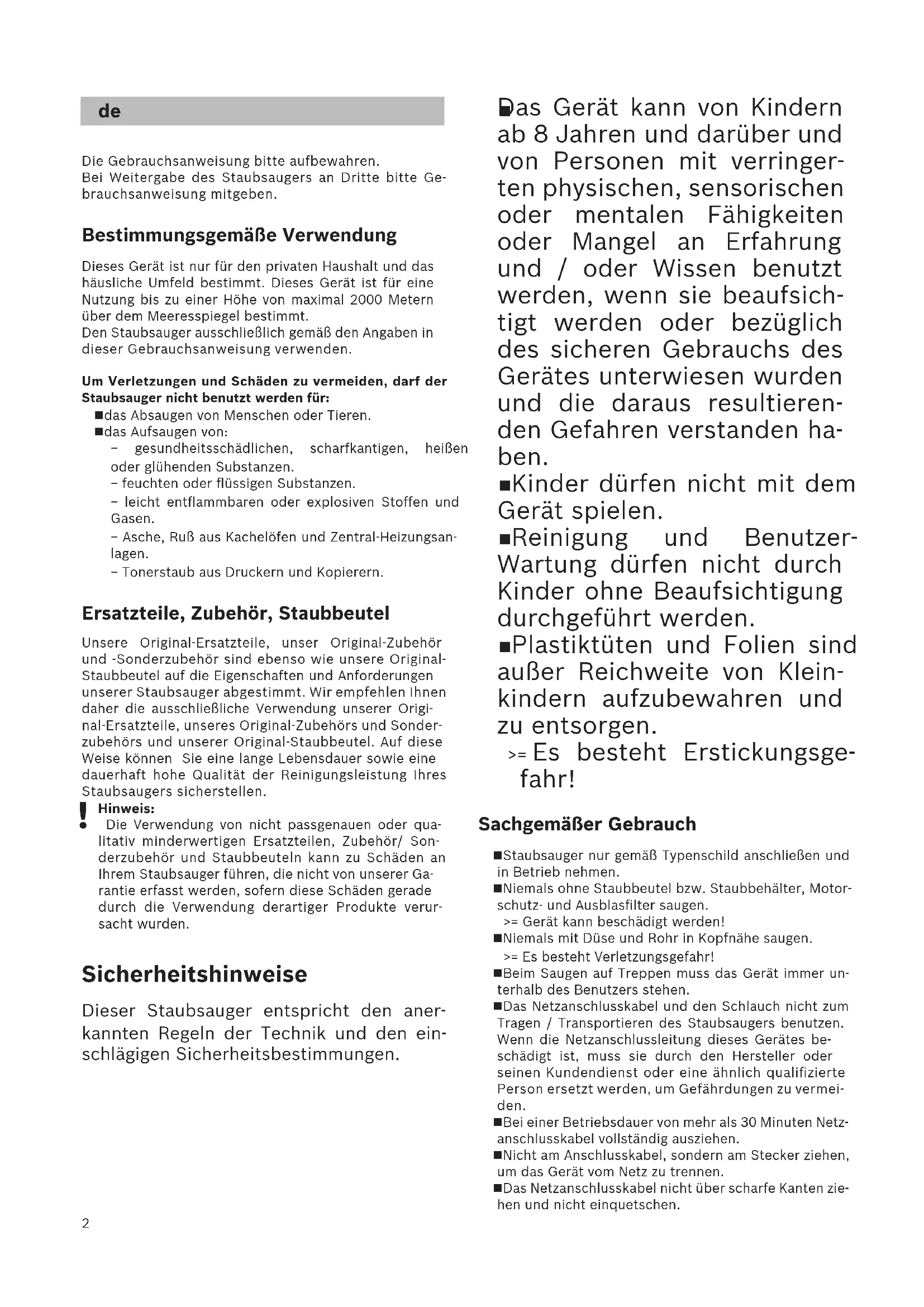 Die Gebrauchsanweisung bitte aufbewahren. Bei Weitergabe des Staubsaugers an Dritte bitte Ge-brauchsanweisung mitgeben. Bestimmungsgemäße Verwendung Dieses Gerät ist nur für den privaten Haushalt und das häusliche Umfeld bestimmt. Dieses Gerät ist für eine Nutzung bis zu einer Höhe von maximal 2000 Metern über dem Meeresspiegel bestimmt. Den Staubsauger ausschließlich gemäß den Angaben in dieser Gebrauchsanweisung verwenden.Um Verletzungen und Schäden zu vermeiden, darf der Staubsauger nicht benutzt werden für: das Absaugen von Menschen oder Tieren. das Aufsaugen von: − gesundheitsschädlichen, scharfkantigen, heißen oder glühenden Substanzen. − feuchten oder flüssigen Substanzen. − leicht entflammbaren oder explosiven Stoffen und Gasen. − Asche, Ruß aus Kachelöfen und Zentral-Heizungsan-lagen. − Tonerstaub aus Druckern und Kopierern. Ersatzteile, Zubehör, Staubbeutel Unsere Original-Ersatzteile, unser Original-Zubehör und -Sonderzubehör sind ebenso wie unsere Original-Staubbeutel auf die Eigenschaften und Anforderungen unserer Staubsauger abgestimmt. Wir empfehlen Ihnen daher die ausschließliche Verwendung unserer Origi-nal-Ersatzteile, unseres Original-Zubehörs und Sonder-zubehörs und unserer Original-Staubbeutel. Auf diese Weise können Sie eine lange Lebensdauer sowie eine dauerhaft hohe Qualität der Reinigungsleistung Ihres Staubsaugers sicherstellen. Hinweis: Die Verwendung von nicht passgenauen oder qua-litativ minderwertigen Ersatzteilen, Zubehör/ Son-derzubehör und Staubbeuteln kann zu Schäden an Ihrem Staubsauger führen, die nicht von unserer Ga-rantie erfasst werden, sofern diese Schäden gerade durch die Verwendung derartiger Produkte verur-sacht wurden. Sicherheitshinweise Dieser Staubsauger entspricht den aner- kannten Regeln der Technik und den ein- schlägigen Sicherheitsbestimmungen.