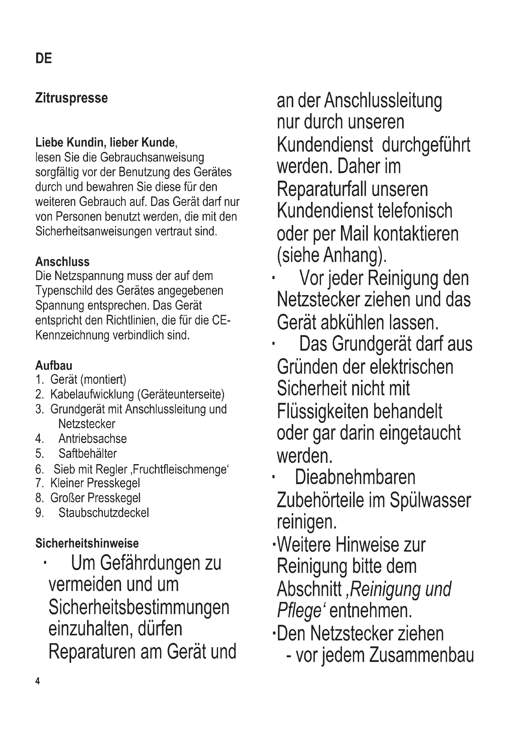 104 x 142 mm Zitruspresse Liebe Kundin, lieber Kunde, lesen Sie die Gebrauchsanweisung sorgfältig vor der Benutzung des Gerätes durch und bewahren Sie diese für den weiteren Gebrauch auf. Das Gerät darf nur von Personen benutzt werden, die mit den Sicherheitsanweisungen vertraut sind. Anschluss Die Netzspannung muss der auf dem Typenschild des Gerätes angegebenen Spannung entsprechen. Das Gerät entspricht den Richtlinien, die für die CE- Kennzeichnung verbindlich sind. Aufbau