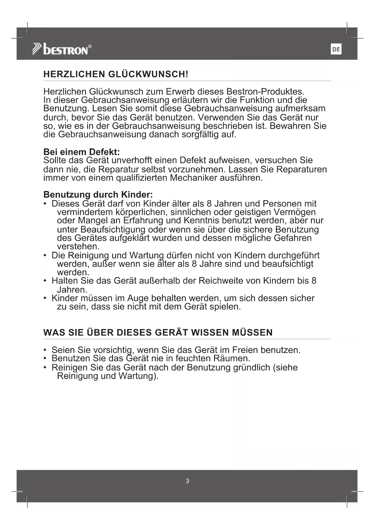 Herzlichen Glückwunsch zum Erwerb theses Bestron-Produktes. In dieser Gebrauchsanweisung erläutern wir die Funktion und die Benutzung. Lesen Sie somit diese Gebrauchsanweisung aufmerksam durch, bevor Sie das Gerät benutzen. Verwenden Sie das Gerät nur so, wie es in der Gebrauchsanweisung beschreiben ist. Bewahren Sie die Gebrauchsanweisung danach sorgfältig auf.