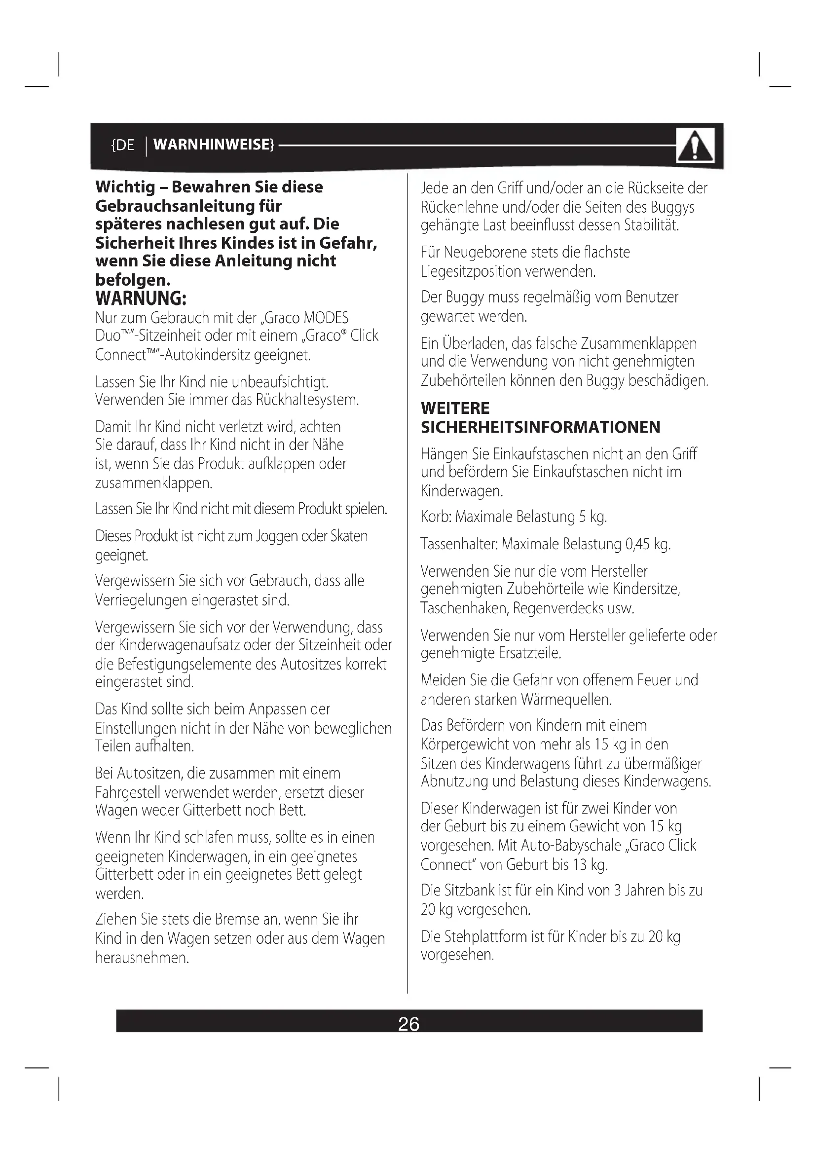 POUSSETTE n’a pas de vis desserrées, de pièces usées, de matériaux ou de coutures déchirés. Remplacez ou réparez-les si nécessaire. N’UTILISEZ PLUS VOTRE POUSSETTE si elle est endommagée ou cassée. POUR NETTOYER LE CHÂSSIS DE LA POUSSETTE, utilisez uniquement du savon de Marseille ou un détergent ménager et de l’eau chaude. NI EAU DE JAVEL, NI ALCOOL, NI NETTOYANT ABRASIF. {FR AVERTISSEMENTS} Contrôlez les différents dispositifs de sécurité et utilisez-les correctement. Les poussettes doivent être contrôlées après une longue période d’inutilisation. Si votre poussette est utilisée par des personnes qui ne la connaissent pas, comme les grands- parents par exemple, montrez-leur comment elle fonctionne. L’habillage pluie doit être utilisé sous la supervision d’un adulte. N’utilisez pas l’habillage pluie sur une poussette ou un siège auto non équipés d’une capote. N’utilisez pas l’habillage pluie à l’intérieur, lorsqu’il fait chaud ou près d’une source de chaleur directe afin que le bébé n’ait pas trop chaud. Démontez complètement l’habillage pluie avant de plier la poussette. Ne lâchez pas votre poussette à proximité des routes ou des voies ferrées, même si le frein est serré, car l’appel d’air dû au passage d’une voiture ou d’un train pourrait la déplacer. Lorsque vous montez ou descendez des escaliers ou des escalators, sortez toujours votre enfant de la poussette et pliez-la. Évitez tout risque de strangulation. N’accrochez PAS de ficelles à votre poussette et ne posez aucun objet muni de ficelles sur votre enfant. Pour prévenir tout renversement, aidez l’enfant à monter dans la poussette et à en descendre. Laissez-le sécher avant de ranger la poussette. Lavez l’habillage pluie à la main. N’UTILISEZ PAS D’EAU DE JAVEL. Lavez la chancelière à la main et étendez-la. N’UTILISEZ PAS D’EAU DE JAVEL. (sur certains modèles) UNE EXPOSITION EXCESSIVE AU SOLEIL peut décolorer prématurément le plastique et le tissu de la poussette.25 {FR INSTRUCTIONS} Ouvrir l’armature de la poussette – voir page 5, images 1, 2, 3 Roues arrière – voir page 5, images 4, 5, 6, 7, 8, 9 Roues avant – voir page 6, images 1, 2 Banquette – voir page 6, images 3, 4 Siège pour tout-petit – voir page 7, images 1, 2 Capote – voir page 7, images 3, 4 Barre de poussette – voir pages 8, images 1, 2, 3, 4, 5 Montures de xation de siège-auto/siège pour tout-petit – voir page 8, images 6, 7, 8 Montures de position avant – avoir page 9, images 1, 2 Pour utiliser le siège pour tout-petit – voir page 9, images 3, 4, 5, 6, 7, 8 Pour retirer le siège pour tout-petit – voir page 10, images 1, 2 Utilisation de la capote – voir page 10, images 3, 4, 5, 6 Pour attacher l’enfant – voir page 11, images 1, 2, 3, 4, 5, 6 Réglage de la position de hauteur du harnais – voir page 11, images 7, 8 Pour relever et incliner le siège – voir page 12, images 1, 2 Freins – voir page 13, images 1, 2 Verrouillage des roues avant – voir page 13, images 3, 4 Pour attacher et retirer le siège-auto pour bébé Graco® Click Connect™ en position arrière – voir page 14, images 1, 2, 3, 4, 5, 6 Pour attacher et retirer le siège-auto pour bébé Graco® Click Connect™ en position avant – voir page 15, images 1, 2, 3, 4, 5, 6 Pour plier la poussette – voir page 16, images 1, 2, 3, 4, 5, 6 Couvre-jambes – voir page 17, images 1, 2, 3, 4, 5 Couvre-sangles – voir page 18, image 1 Utilisation de l’habillage pluie – voir page 18, images 2, 3, 4, 526 {DE WARNHINWEISE} Wichtig – Bewahren Sie diese Gebrauchsanleitung für späteres nachlesen gut auf. Die Sicherheit Ihres Kindes ist in Gefahr, wenn Sie diese Anleitung nicht befolgen. WARNUNG: Nur zum Gebrauch mit der „Graco MODES Duo™“-Sitzeinheit oder mit einem „Graco® Click Connect™“-Autokindersitz geeignet. Lassen Sie Ihr Kind nie unbeaufsichtigt. Verwenden Sie immer das Rückhaltesystem. Damit Ihr Kind nicht verletzt wird, achten Sie darauf, dass Ihr Kind nicht in der Nähe ist, wenn Sie das Produkt aufklappen oder zusammenklappen. Lassen Sie Ihr Kind nicht mit diesem Produkt spielen. Dieses Produkt ist nicht zum Joggen oder Skaten geeignet. Vergewissern Sie sich vor Gebrauch, dass alle Verriegelungen eingerastet sind. Vergewissern Sie sich vor der Verwendung, dass der Kinderwagenaufsatz oder der Sitzeinheit oder die Befestigungselemente des Autositzes korrekt eingerastet sind. Das Kind sollte sich beim Anpassen der Einstellungen nicht in der Nähe von beweglichen Teilen aufhalten. Bei Autositzen, die zusammen mit einem Fahrgestell verwendet werden, ersetzt dieser Wagen weder Gitterbett noch Bett. Wenn Ihr Kind schlafen muss, sollte es in einen geeigneten Kinderwagen, in ein geeignetes Gitterbett oder in ein geeignetes Bett gelegt werden. Ziehen Sie stets die Bremse an, wenn Sie ihr Kind in den Wagen setzen oder aus dem Wagen herausnehmen. Jede an den Griff und/oder an die Rückseite der Rückenlehne und/oder die Seiten des Buggys gehängte Last beeinflusst dessen Stabilität. Für Neugeborene stets die flachste Liegesitzposition verwenden. Der Buggy muss regelmäßig vom Benutzer gewartet werden. Ein Überladen, das falsche Zusammenklappen und die Verwendung von nicht genehmigten Zubehörteilen können den Buggy beschädigen. WEITERE SICHERHEITSINFORMATIONEN Hängen Sie Einkaufstaschen nicht an den Griff und befördern Sie Einkaufstaschen nicht im Kinderwagen. Korb: Maximale Belastung 5 kg. Tassenhalter: Maximale Belastung 0,45 kg. Verwenden Sie nur die vom Hersteller genehmigten Zubehörteile wie Kindersitze, Taschenhaken, Regenverdecks usw. Verwenden Sie nur vom Hersteller gelieferte oder genehmigte Ersatzteile. Meiden Sie die Gefahr von offenem Feuer und anderen starken Wärmequellen. Das Befördern von Kindern mit einem Körpergewicht von mehr als 15 kg in den Sitzen des Kinderwagens führt zu übermäßiger Abnutzung und Bela