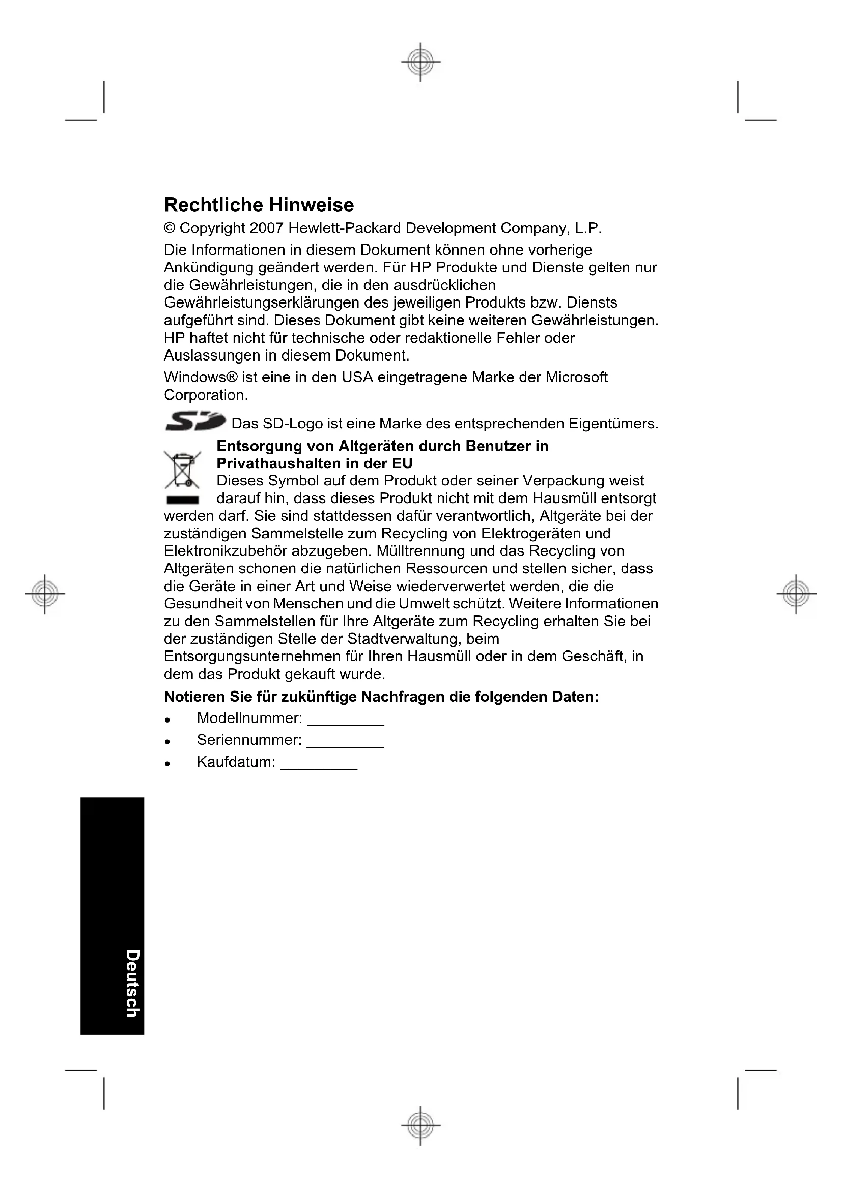 - Se si accende la fotocamera solo per visualizzare le immagini, spostare su e solo dopo accendere la fotocamera per avviare la modalità Riproduzione senza estendere l'obiettivo. Riferimento rapido della fotocamera 23 Italiano• Quando si trasferiscono o si stampano le immagini, posizionare la fotocamera nell'alloggiamento opzionale HP Photosmart collegato all'alimentazione CA. Per ulteriori informazioni sulle batterie, visitare il sito all'indirizzo www.hp.com/support ed eseguire una ricerca del codice AA-400 o consultare l'Appendice A nel Manuale dell'utente in formato elettronico. 24 HP Photosmart M440/M540/M630 series ItalianoHP Photosmart M440/M540/ M630 series DeutschRechtliche Hinweise © Copyright 2007 Hewlett-Packard Development Company, L.P. Die Informationen in diesem Dokument können ohne vorherige Ankündigung geändert werden. Für HP Produkte und Dienste gelten nur die Gewährleistungen, die in den ausdrücklichen Gewährleistungserklärungen des jeweiligen Produkts bzw. Diensts aufgeführt sind. Dieses Dokument gibt keine weiteren Gewährleistungen. HP haftet nicht für technische oder redaktionelle Fehler oder Auslassungen in diesem Dokument. Windows® ist eine in den USA eingetragene Marke der Microsoft Corporation. Das SD-Logo ist eine Marke des entsprechenden Eigentümers. Entsorgung von Altgeräten durch Benutzer in Privathaushalten in der EU Dieses Symbol auf dem Produkt oder seiner Verpackung weist darauf hin, dass dieses Produkt nicht mit dem Hausmüll entsorgt werden darf. Sie sind stattdessen dafür verantwortlich, Altgeräte bei der zuständigen Sammelstelle zum Recycling von Elektrogeräten und Elektronikzubehör abzugeben. Mülltrennung und das Recycling von Altgeräten schonen die natürlichen Ressourcen und stellen sicher, dass die Geräte in einer Art und Weise wiederverwertet werden, die die Gesundheit von Menschen und die Umwelt schützt. Weitere Informationen zu den Sammelstellen für Ihre Altgeräte zum Recycling erhalten Sie bei der zuständigen Stelle der Stadtverwaltung, beim Entsorgungsunternehmen für Ihren Hausmüll oder in dem Geschäft, in dem das Produkt gekauft wurde. Notieren Sie für zukünftige Nachfragen die folgenden Daten: